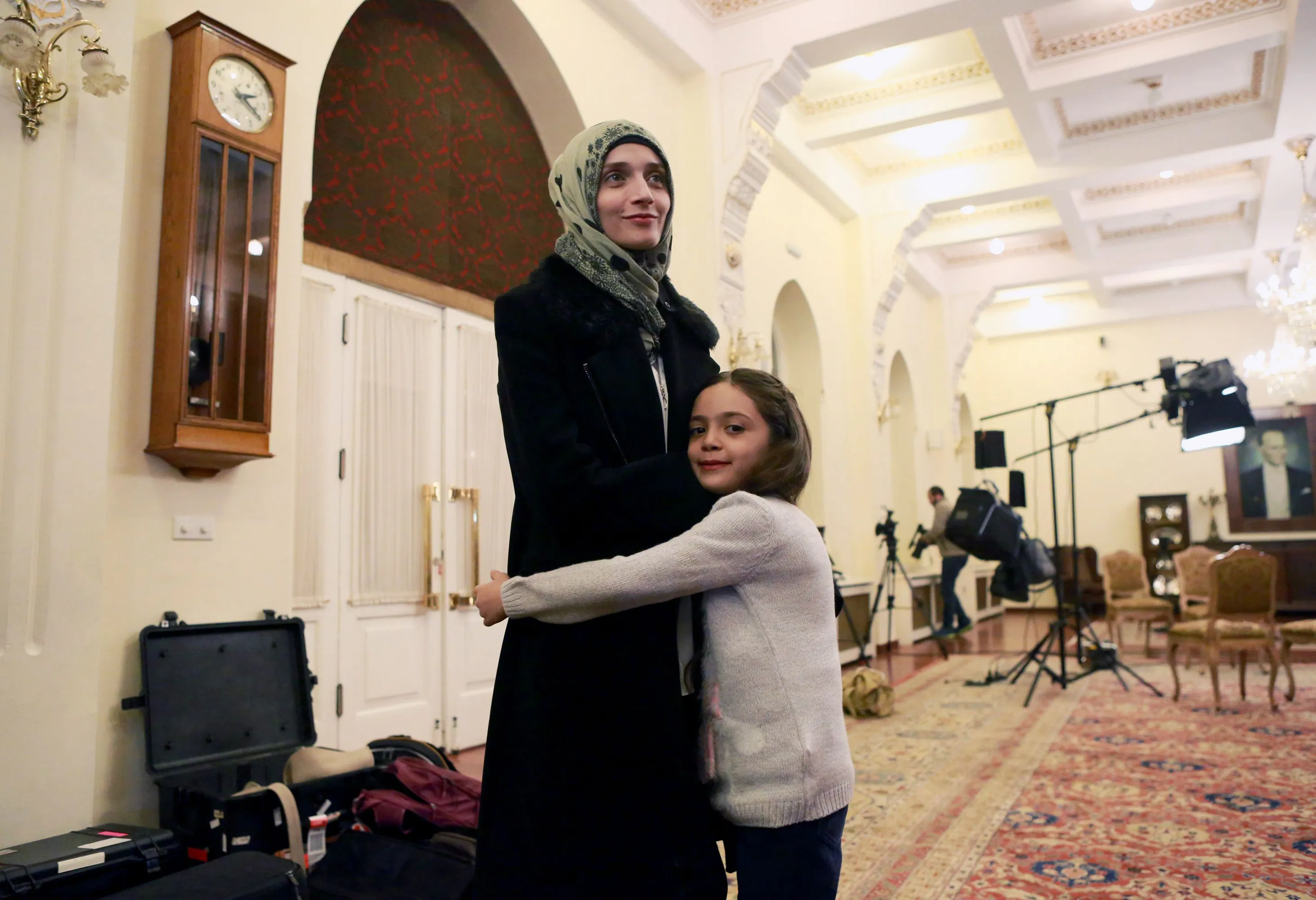 Syrian girl Bana al-Abed (R), known as Aleppo's tweeting girl, hugs her mother Fatemah during an interview in Ankara, Turkey, on December 22, 2016. The young Syrian girl was one of thousands of people evacuated from once rebel-held areas of Aleppo in the last days under a deal brokered by Turkey and Russia. She was evacuated on Monday and Turkish officials promised then she would come to Turkey with her family. But it was not clear when she had crossed over. (Photo by Adem Altan/AFP Photo)
