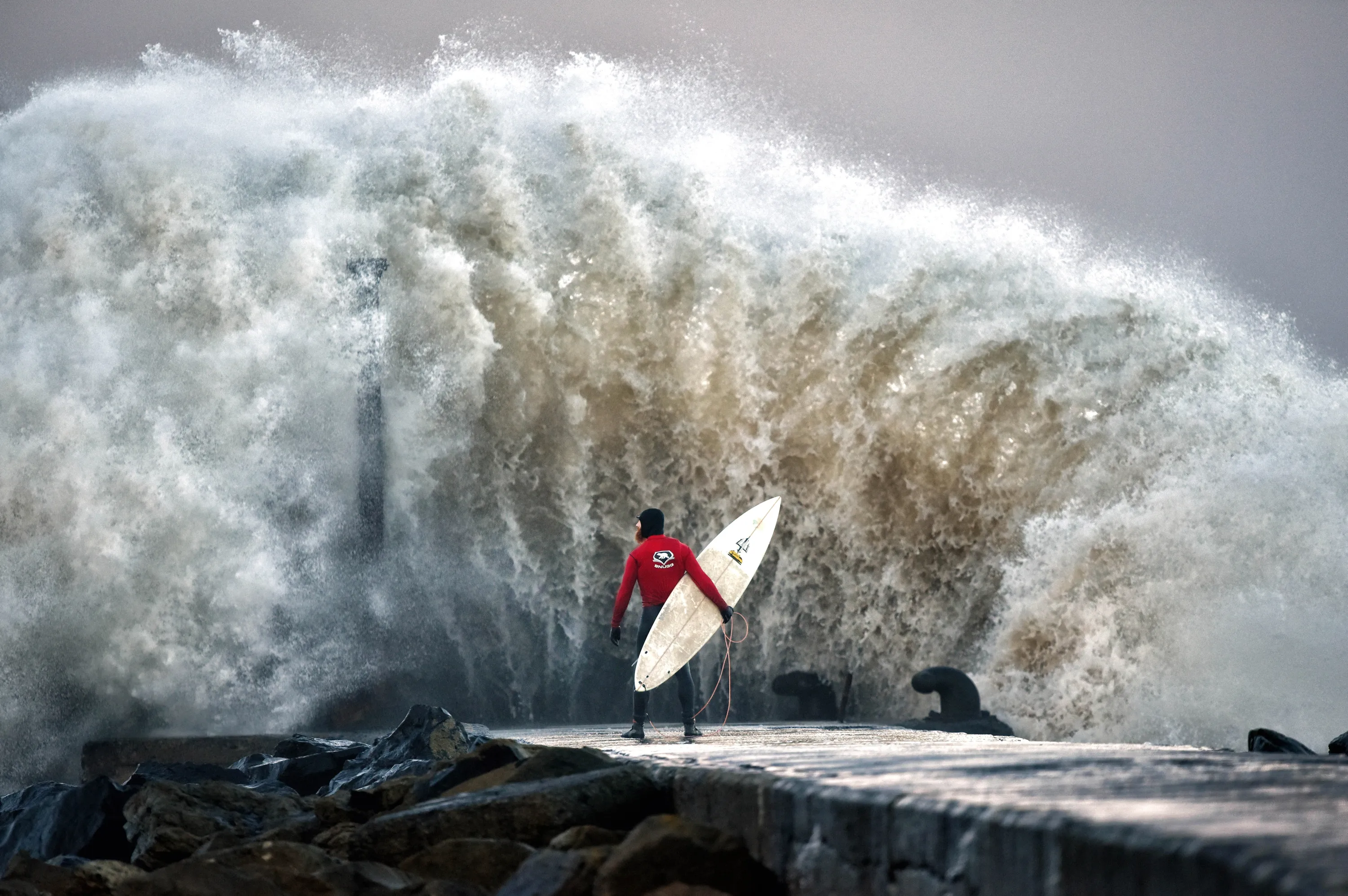 A huge wave crashes against Castlerock pier as professional surfer Al Mennie waits on a break in the swell on December 22, 2016 in Coleraine, Northern Ireland. Storm Barbara is expected to cause major travel disruption when it hits northern parts of the UK later with 90mph winds predicted. The Met Office has issued an amber warning with the worst effects of the storm expected on Friday and Saturday. (Photo by Charles McQuillan/Getty Images)