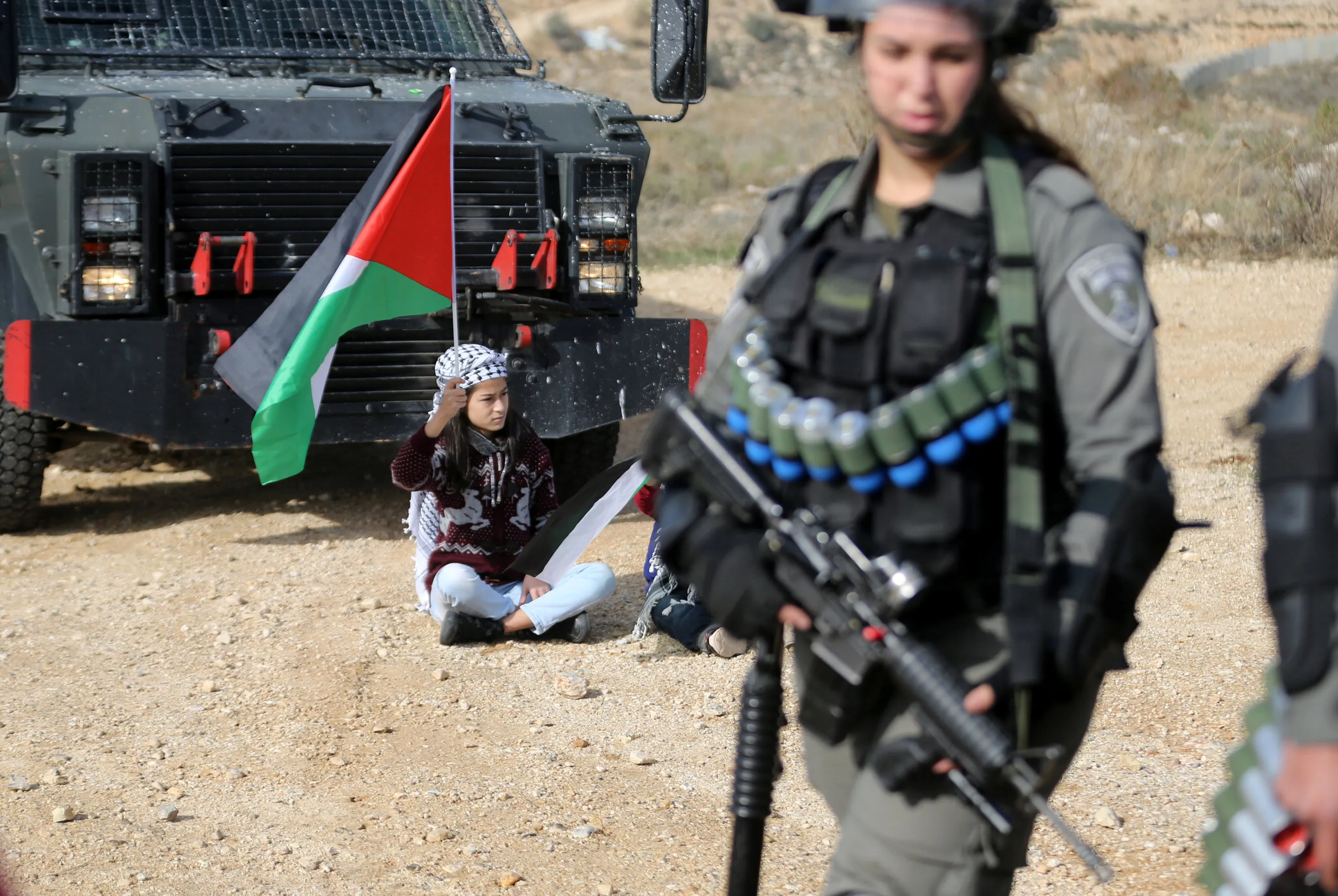 A girl holding a Palestinian flag sits on the ground as an Israeli border policewoman stands guard during a protest against the Israeli barrier, in the West Bank village of Bilin near Ramallah December 23, 2016. (Photo by Mohamad Torokman/Reuters)