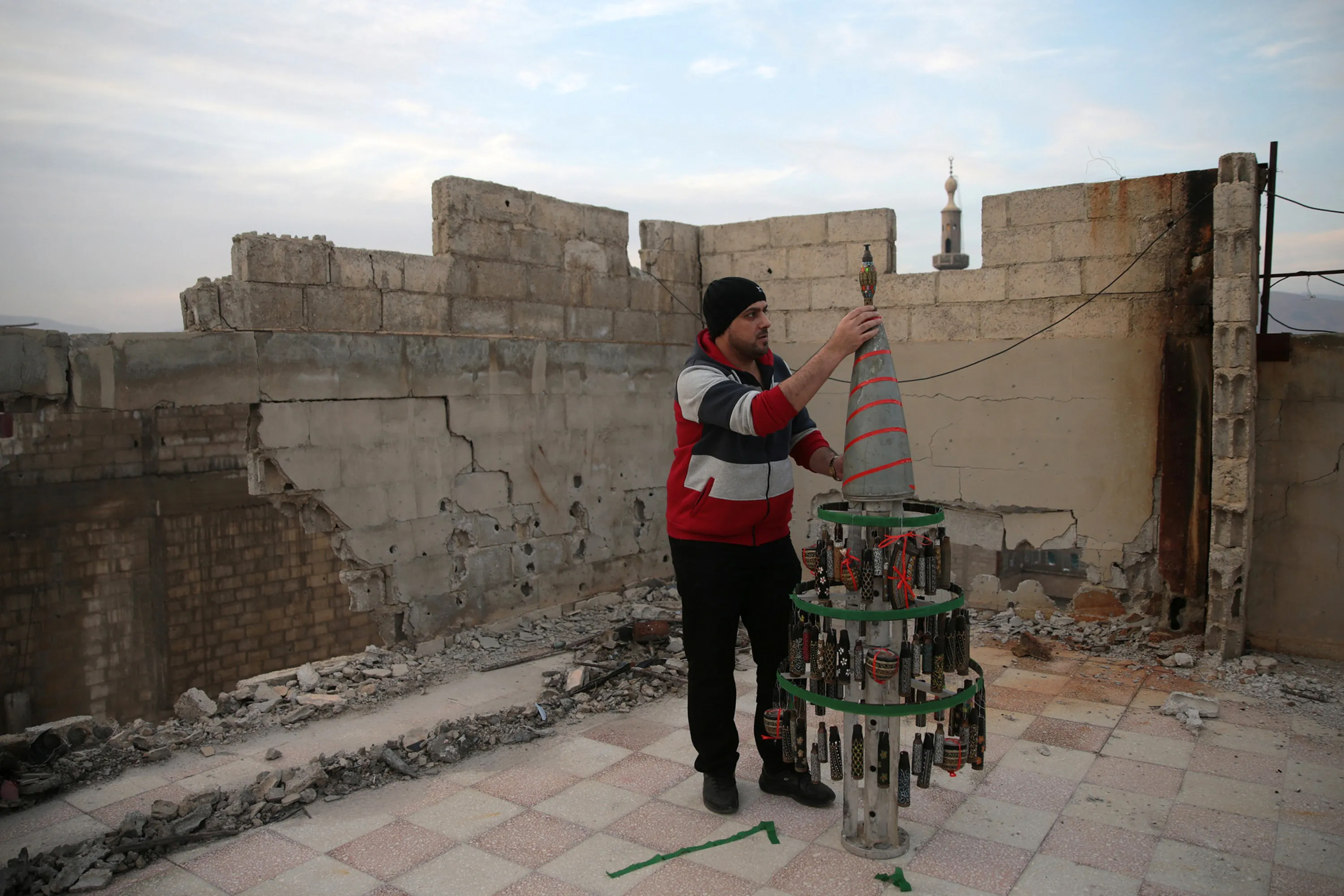 Akram Abu al-Foz, decorates a christmas tree from empty shells he collected and drew on, in the rebel held besieged city of Douma, in the eastern Damascus suburb of Ghouta, Syria December 23, 2016. (Photo by Bassam Khabieh/Reuters)