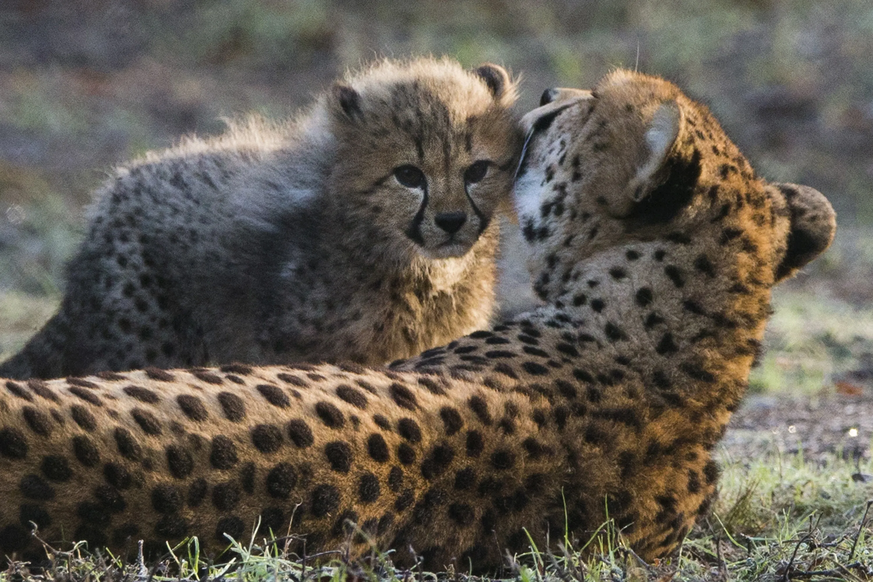 A Cheetah mother licks one of her six cubs as they venture outside for the first time after the cubs birth at Burgers' Zoo in Arnhem, eastern Netherlands, Tuesday, December 20, 2016. (Photo by Peter Dejong/AP Photo)