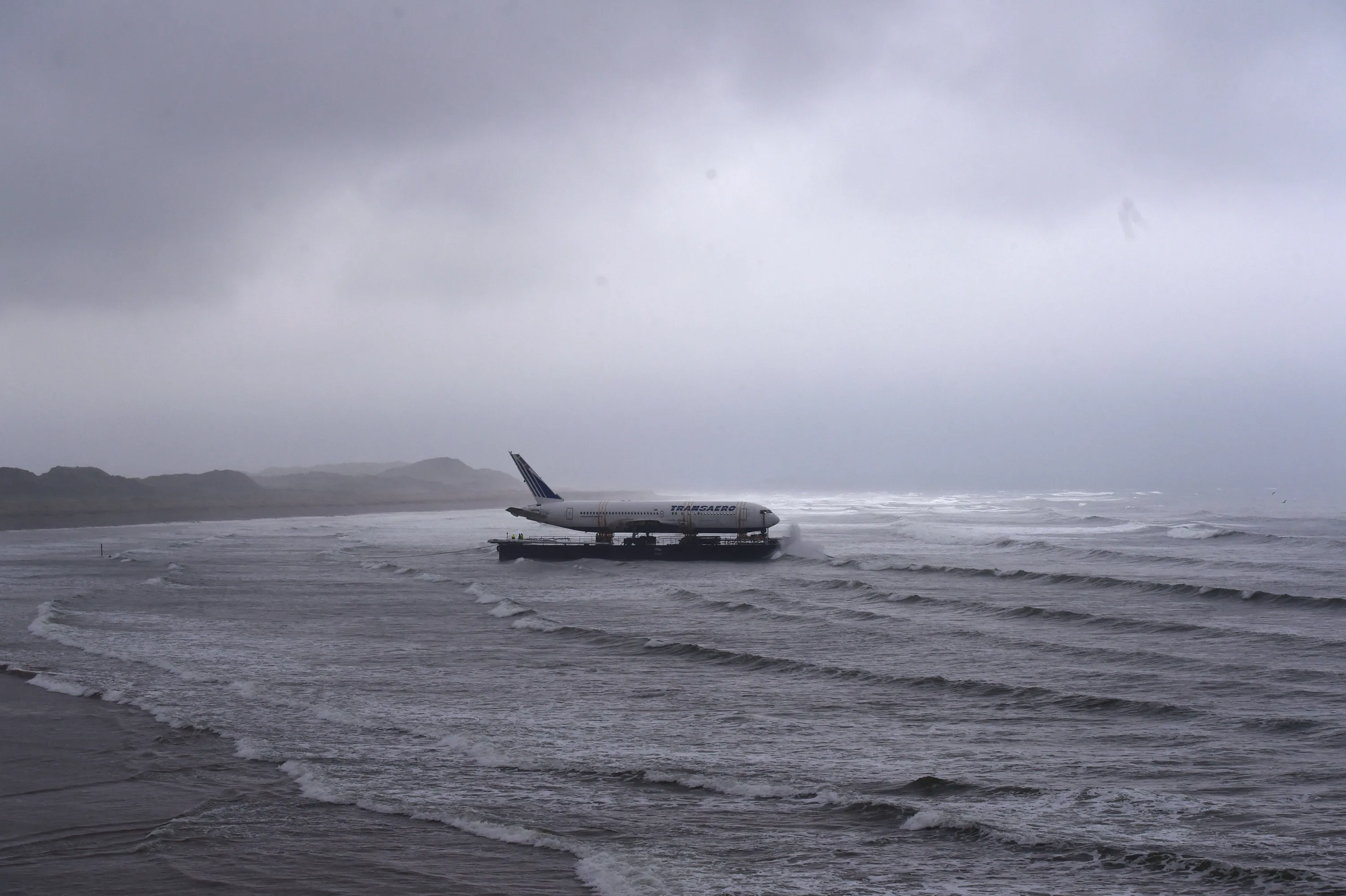 IRELAND: Bad weather surrounds a Boeing 767 airplane as it arrives onto Enniscrone beach after it was tugged from Shannon airport out to sea around the west coast of Ireland, May 7, 2016. It is destined for local funeral director David McGowan's proposed Glamping Village to be used as accommodation in Sligo, Ireland. (Photo by Clodagh Kilcoyne/Reuters)