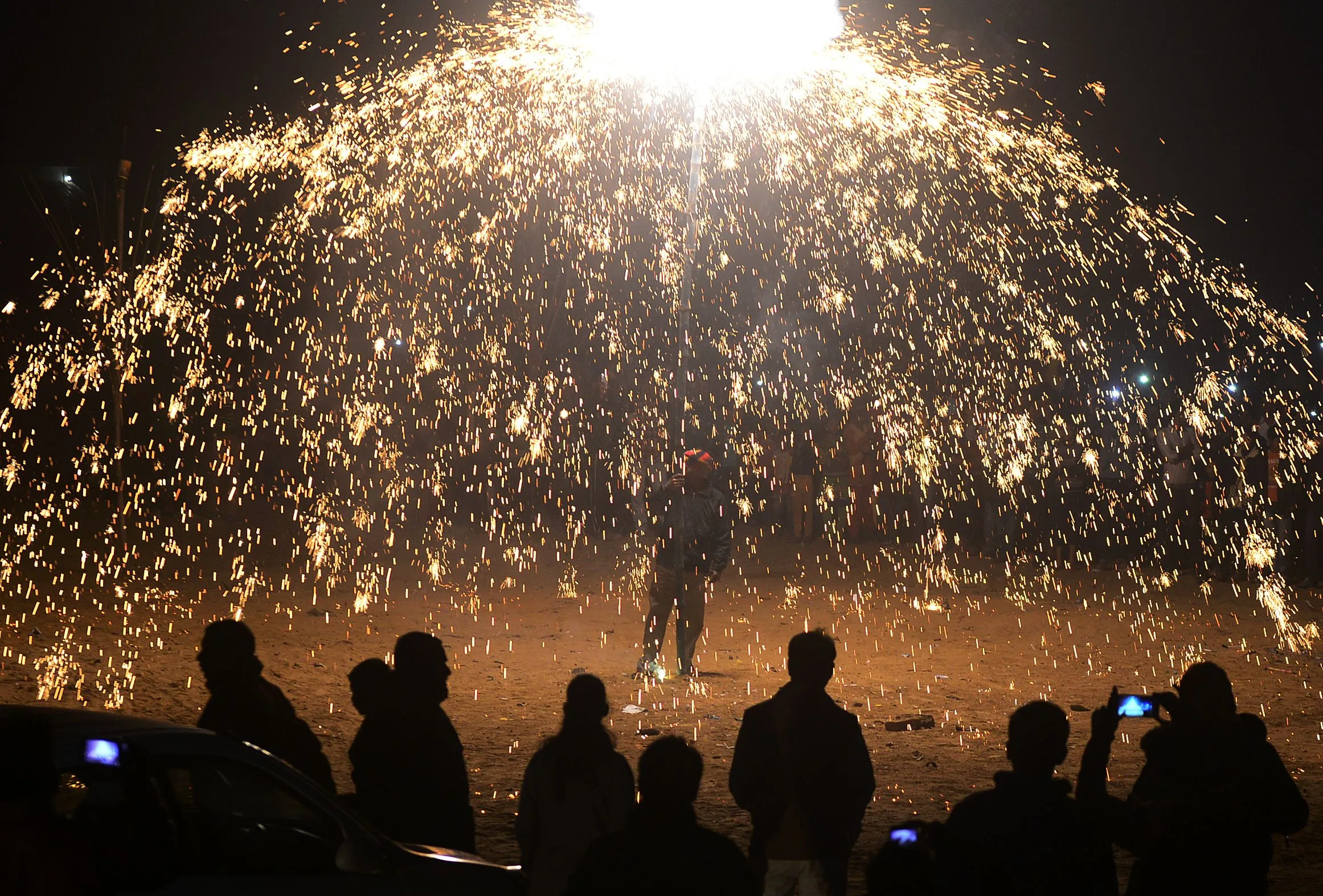 Indian Christian devotees watch a fireworks display marking Christmas Eve outside St. Peter's Church in Allahabad on December 24, 2016. (Photo by Sanjay Kanojia/AFP Photo)