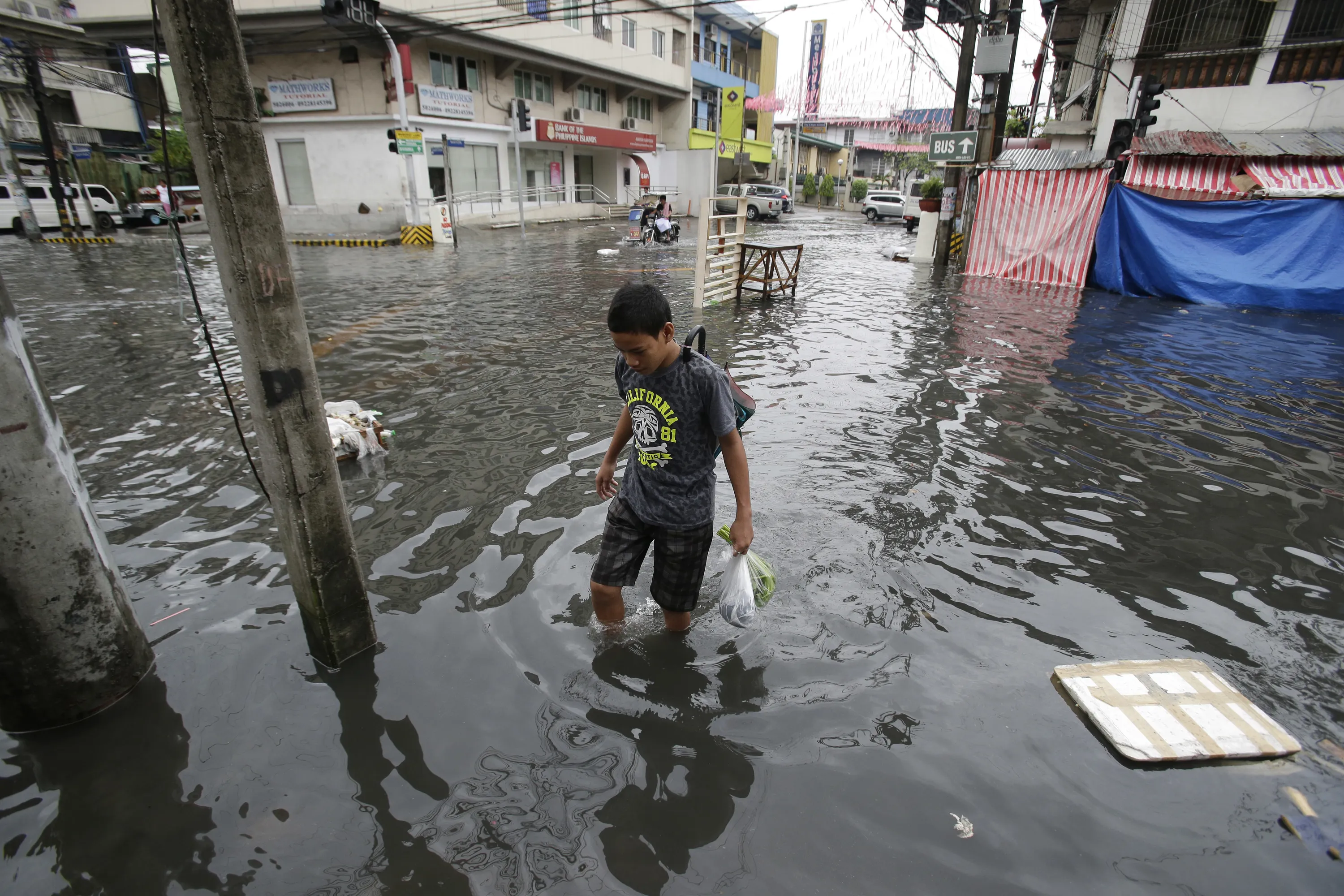 A man wades along a flooded street caused by rains from Typhoon Nock-Ten in Quezon city, north of Manila, Philippines on Monday, December 26, 2016. (Photo by Aaron Favila/AP Photo)