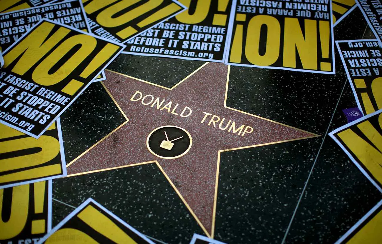 The Hollywood Walk of Fame star for Donald Trump is framed in protest posters during a demonstration in reaction to a Twitter post by US President- elect Trump referring to expansion of the United States nuclear arsenal on December 25 in Los Angeles, California. (Photo by David McNew/AFP Photo)