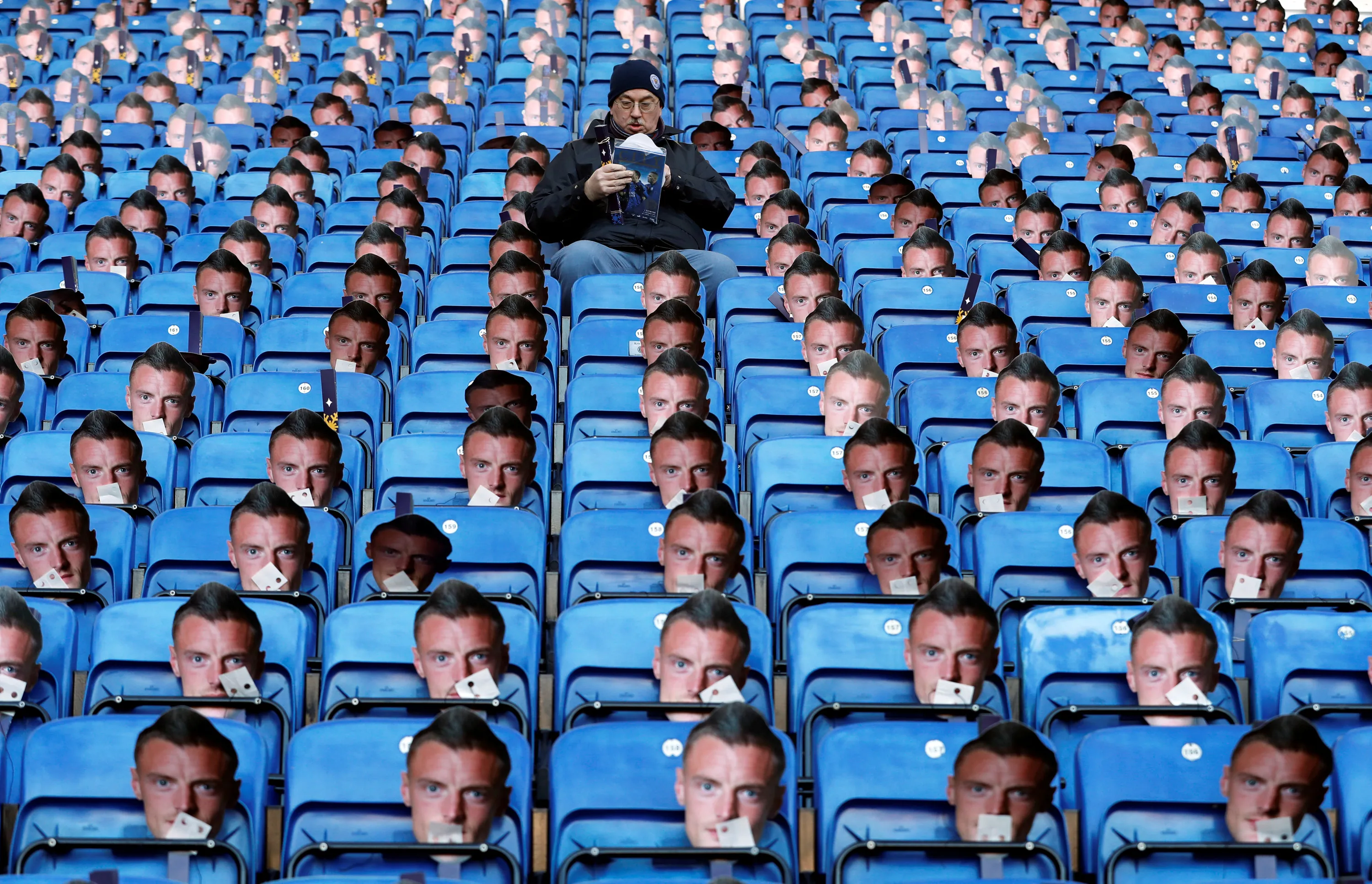 A fan takes his seat surrounded by paper masks of Leicester's Jamie Vardy prior to kickoff during the Premier League match between Leicester City and Everton at The King Power Stadium on December 26, 2016 in Leicester, England. (Photo by Carl Recine/Reuters/Action Images/Livepic)