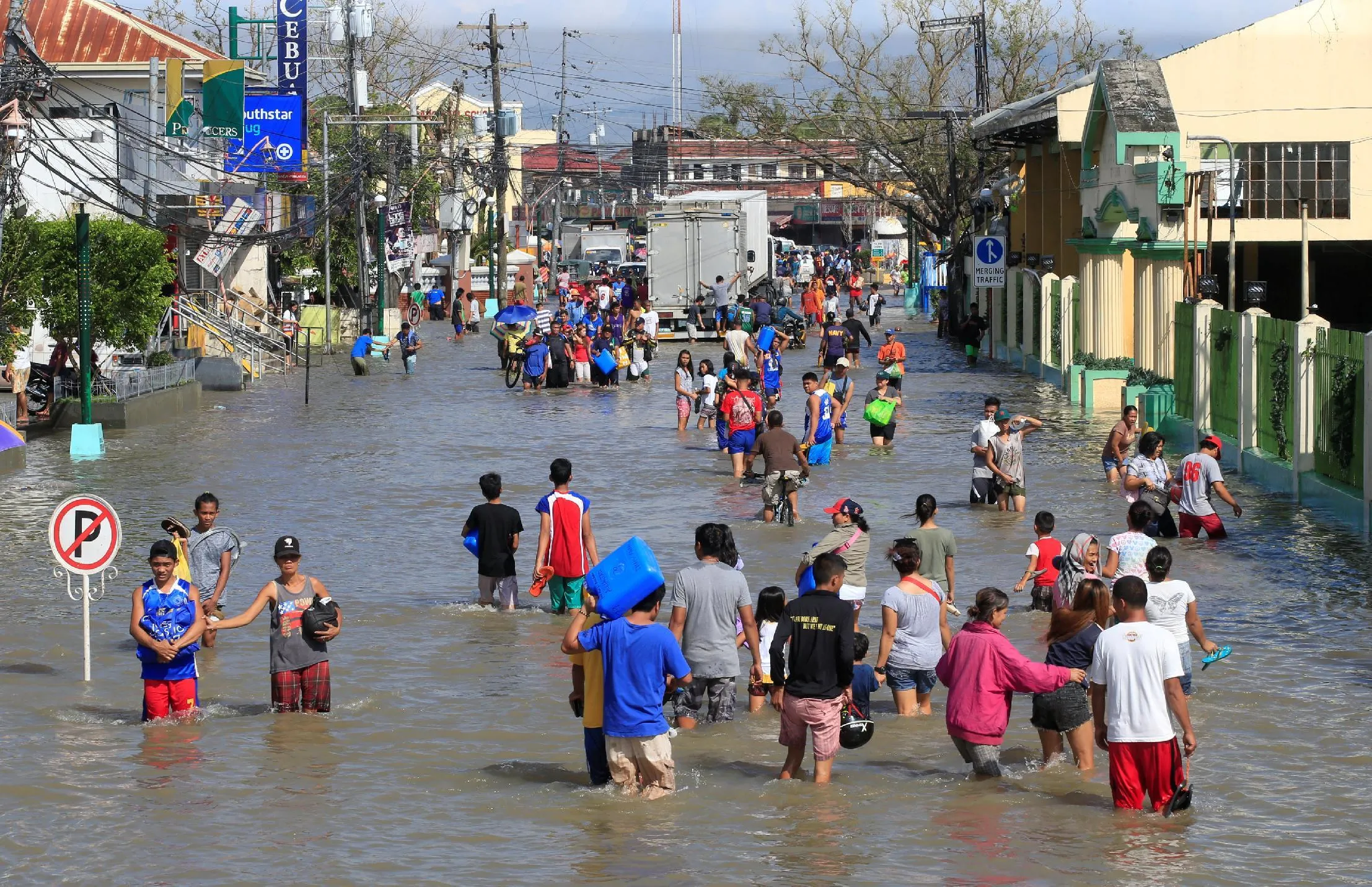 Residents wade across a flooded street brought by heavy rains and strong winds of Typhoon Nock-ten which cut through Naboa town, Camarines Sur, Bicol region, central Philippines December 27, 2016. (Photo by Romeo Ranoco/Reuters)