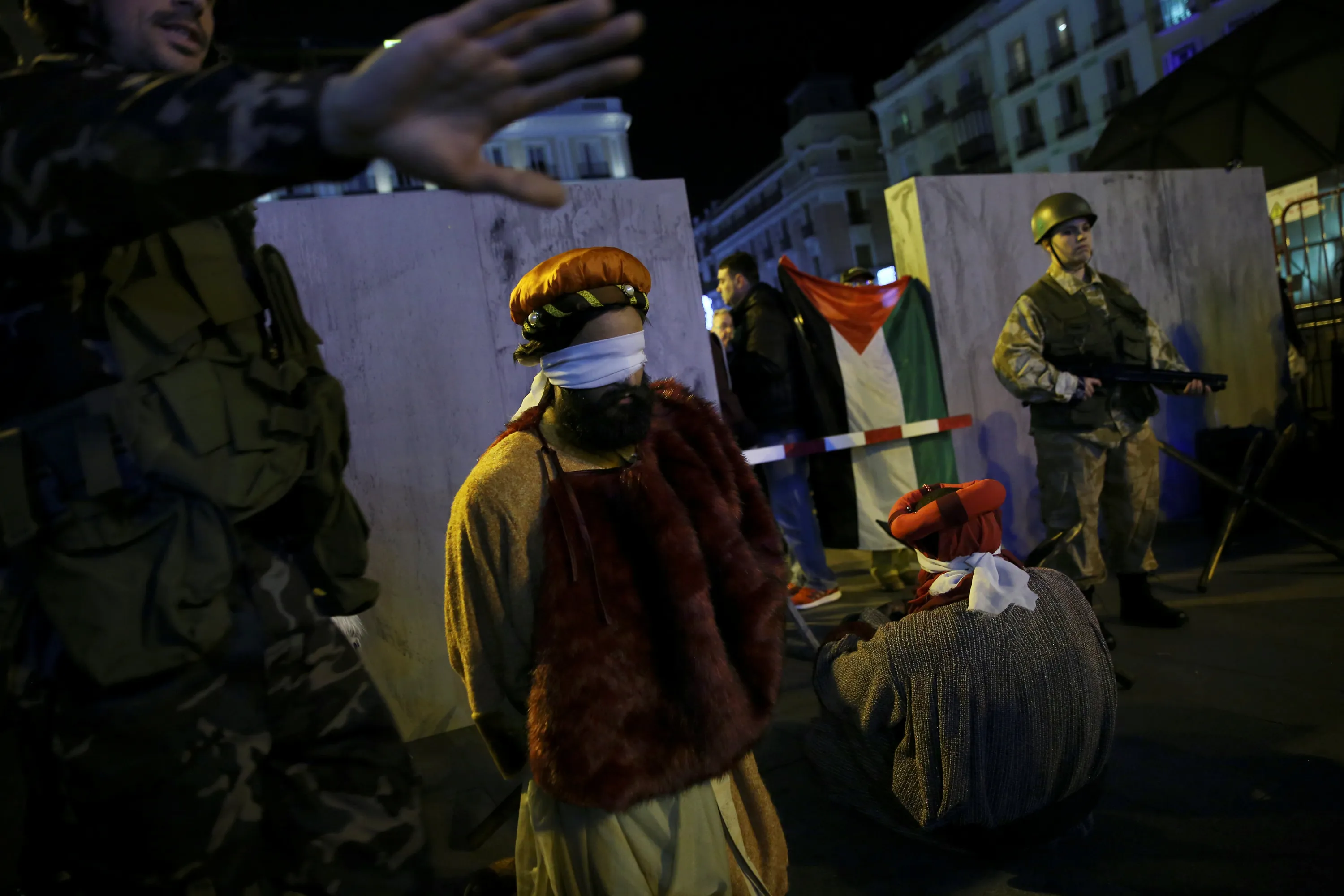 Demonstrators dressed as the Three Wise Men are detained at a mock Israeli checkpoint in the West Bank city of Bethlehem as part of a protest by Pro-Palestine supporters in Madrid, Spain, December 27, 2016. (Photo by Susana Vera/Reuters)