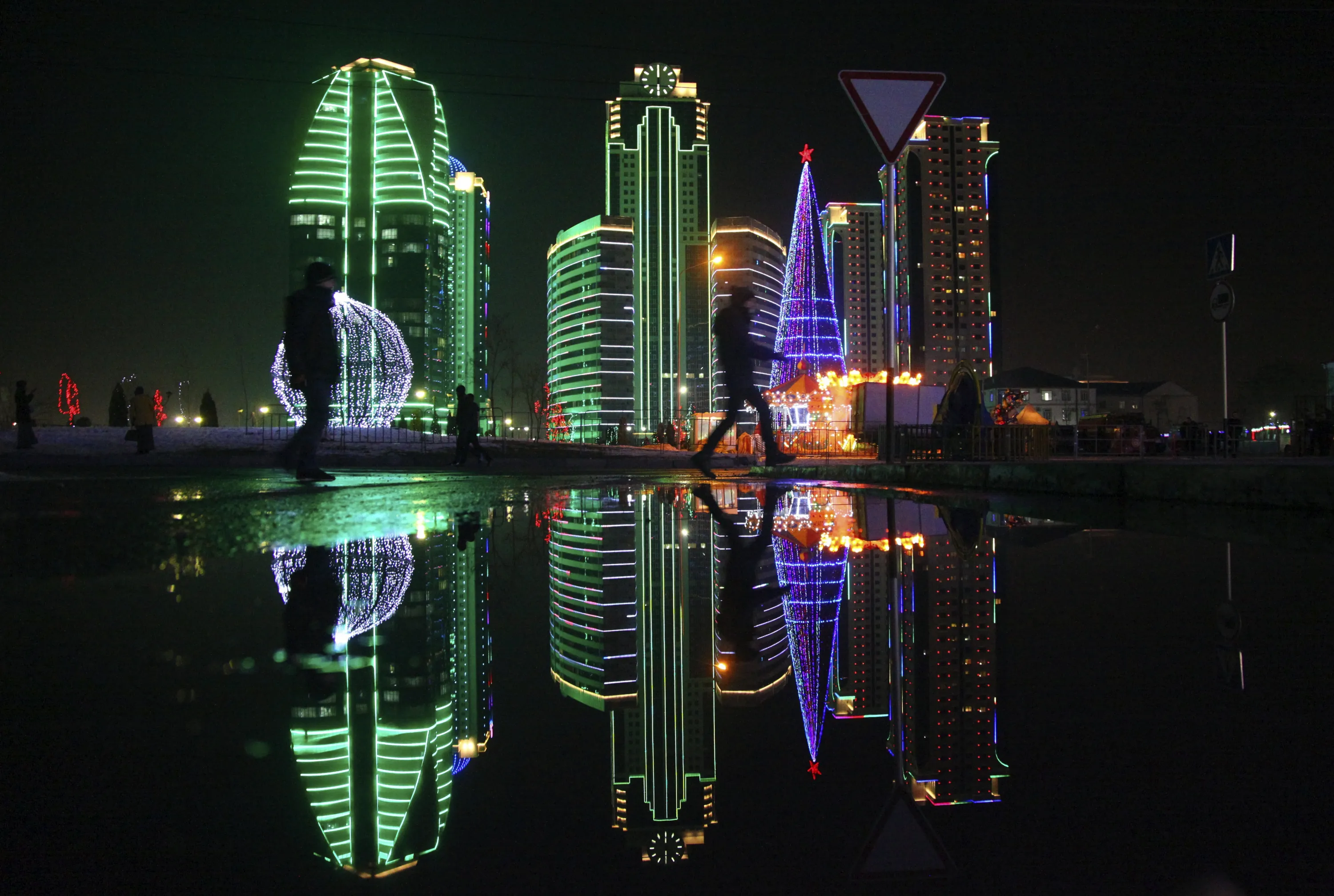 A Christmas tree and skyscrapers illuminated for New Year celebration are seen in downtown Grozny, the capital of Chechnya, Russia, Wednesday, December 28, 2016. (Photo by Musa Sadulayev/AP Photo)