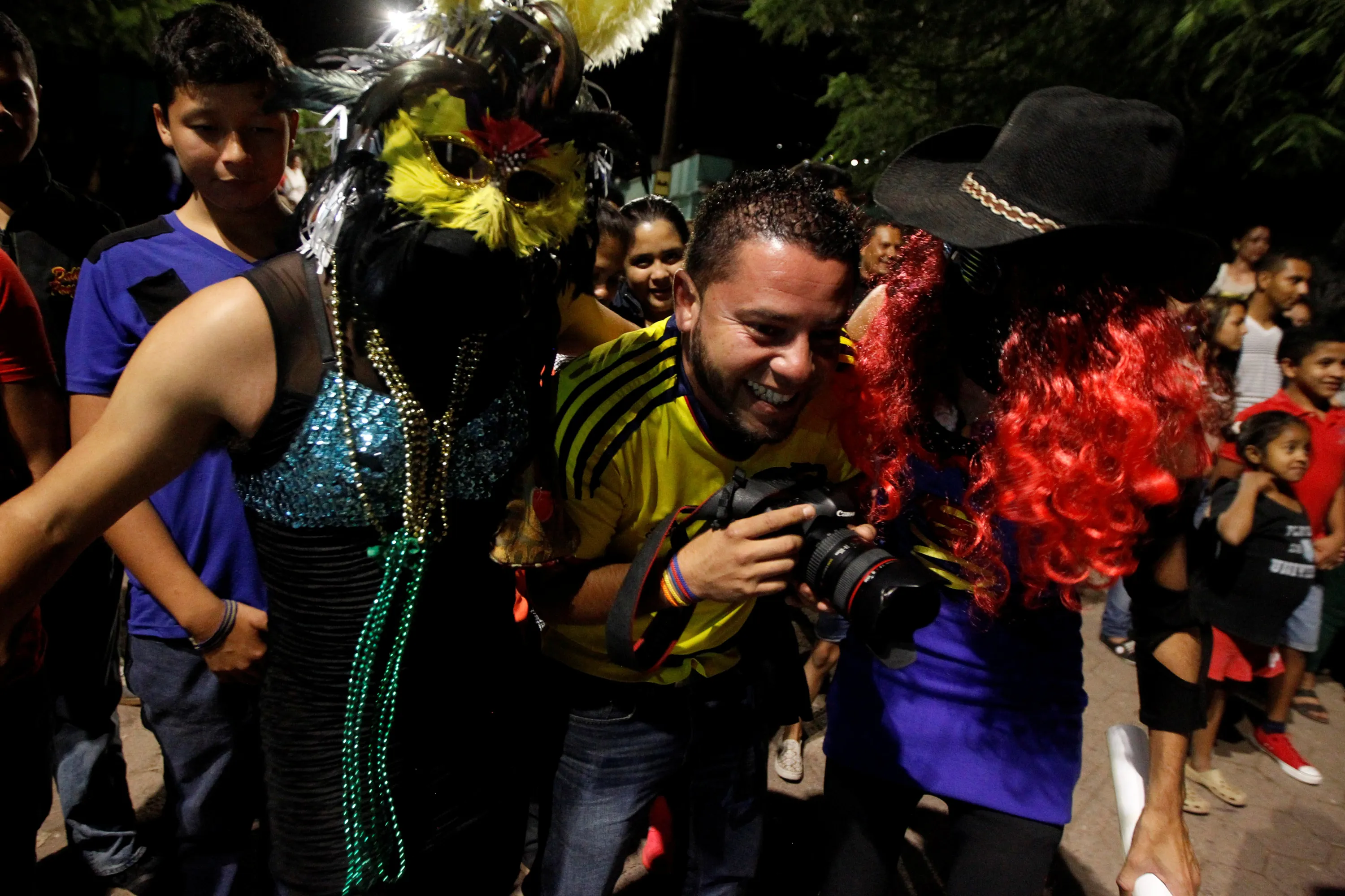 A photographer smiles in between people wearing masks as they take part in a procession on Holy Innocents Day in Tegucigalpa, Honduras, December 28, 2016. (Photo by Jorge Cabrera/Reuters)
