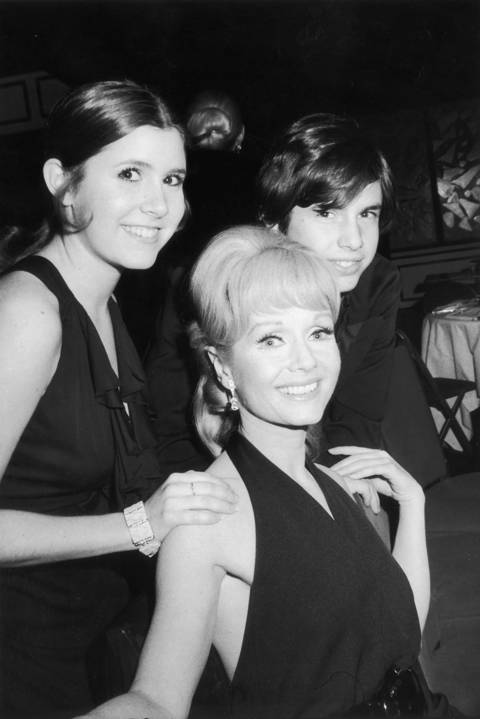 American actor Debbie Reynolds sits and smiles with her children, actor Carrie Fisher and Todd Fisher, as they attend the opening night party for the Broadway musical revival “Irene”, in which Reynolds starred, New York City, 13th March 1973. The music was composed by Hal Tierney, with lyrics by Joseph McCarthy. (Photo by Tim Boxer/Hulton Archive/Getty Images)
