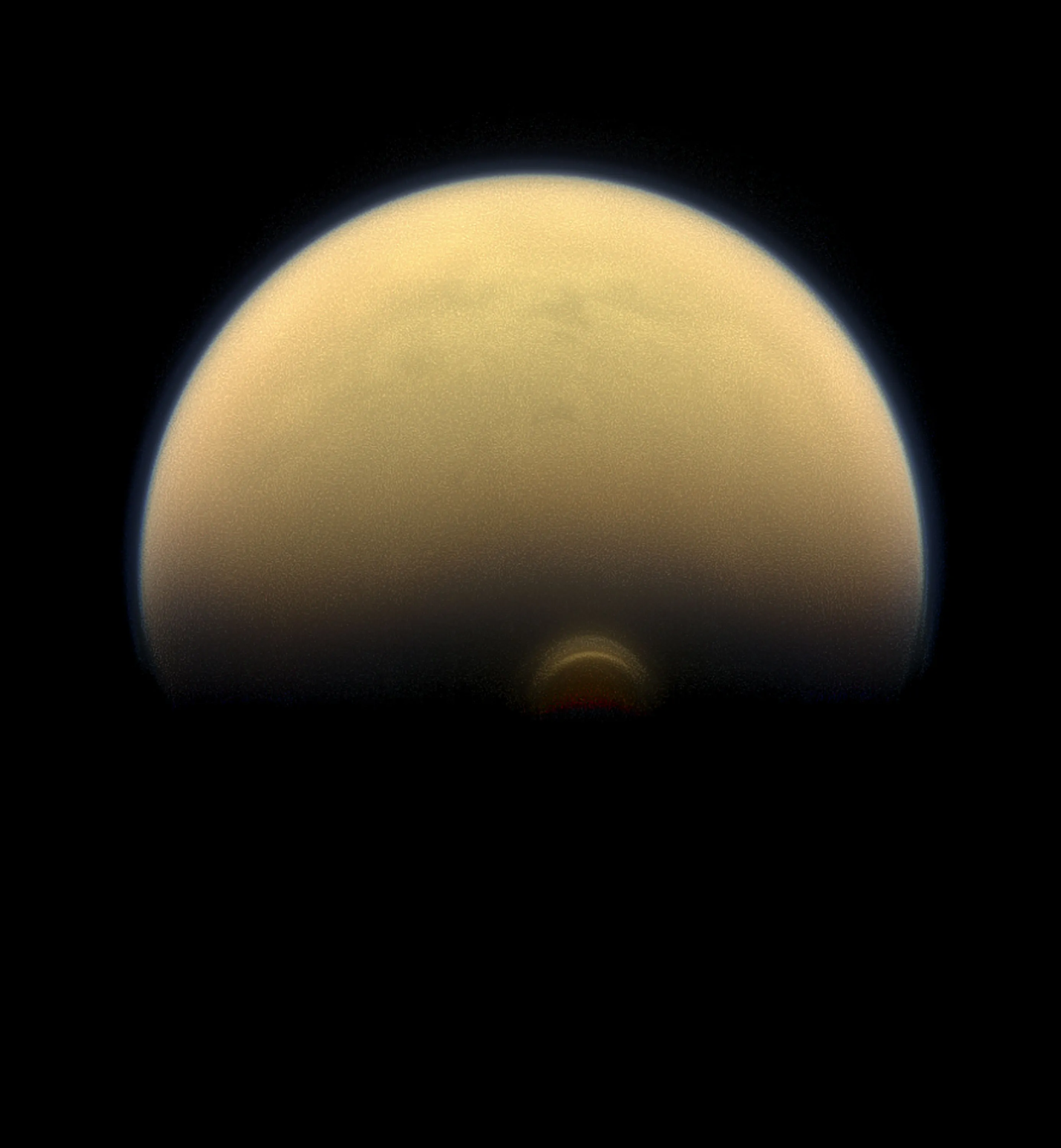 In this image released by NASA, the south polar vortex at Saturn's moon Titan still stands out against the orange and blue haze layers that are characteristic of Titan's atmosphere. Images like this, from NASA's Cassini spacecraft, lead scientists to conclude that the polar vortex clouds form at a much higher altitude – where sunlight can still reach – than the lower-altitude surrounding haze. (Photo by AFP Photo/NASA/JPL-Caltech/Space Science Institute)