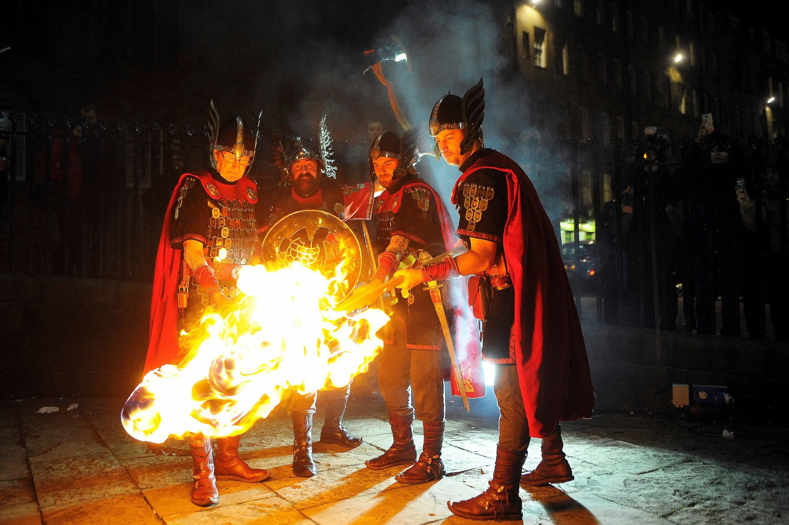 Members of the Up Helly AA Vikings from Shetland light their torches as they prepare to take part in a torchlit procession through the streets of Edinburgh in Scotland, December 30, 2016, as the city begins to celebrate Hogmanay. The procession is the opening event of Edinburghs Hogmanay 2016/17. Over 40,000 people are expected to throng the streets of the capital to watch the torch carriers as they illuminate the city, culminating in a breath-taking fireworks finale. (Photo by Andy Buchanan/AFP Photo)