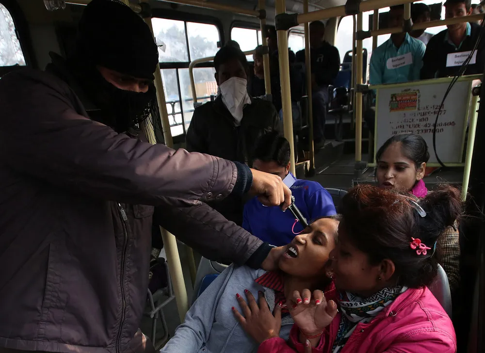 An Indian man holding a toy gun acting as a terrorist capture hostages during a mock Bus Hijack by terrorists as part of an anti-terrorist drill, in New Delhi, India, 30 December 2016. District Disaster Management Authority organized the mock Bus Hijack by terrorists as Delhi remains on a high alert during New Year. (Photo by Rajat Gupta/EPA)