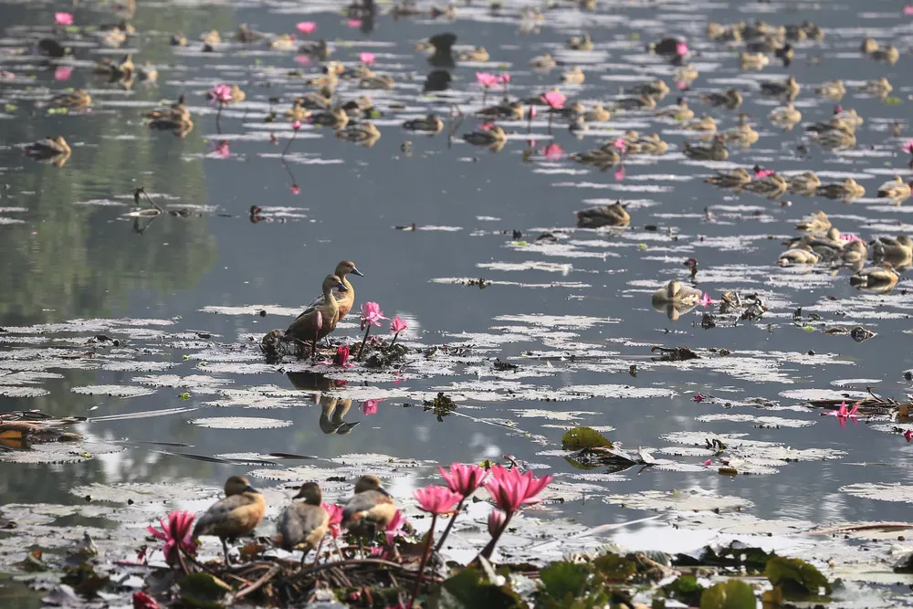 Migratory birds sit at Jahangirnagar University swamp in Savar, near Dhaka, Bangladesh, Friday, December 30, 2016. Migratory birds travel thousands of miles to Bangladesh during the Siberian winter in October and return home in March. (Photo by AP Photo)