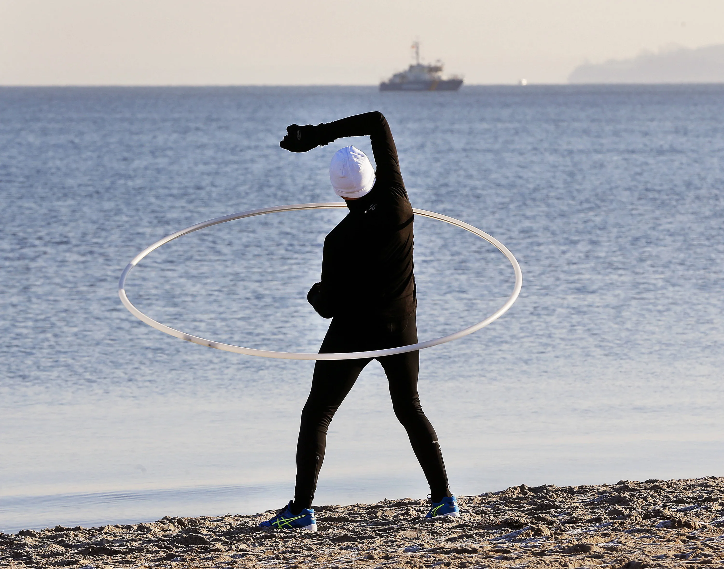 An old man exercises with a huge ring at he beach of the Baltic Sea on Timmendorfer Strand, Germany, Friday, December 30, 2016. (Photo by Michael Probst/AP Photo)