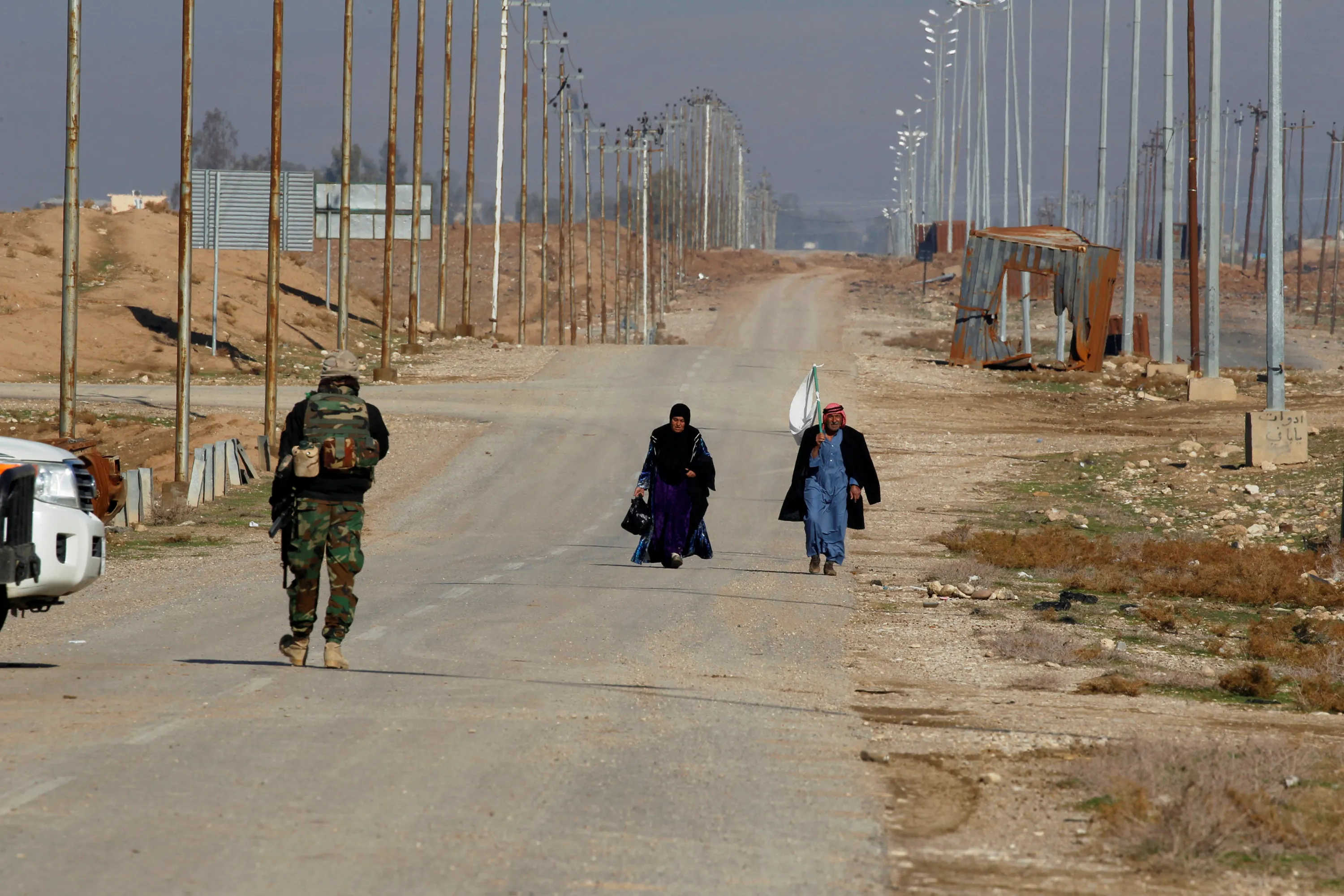 Displaced people from Mosul, who are fleeing from Islamic State militants, carry a white flag near Iraqi army personnel, north of Mosul, Iraq, December 29, 2016. (Photo by Khalid al Mousily/Reuters)