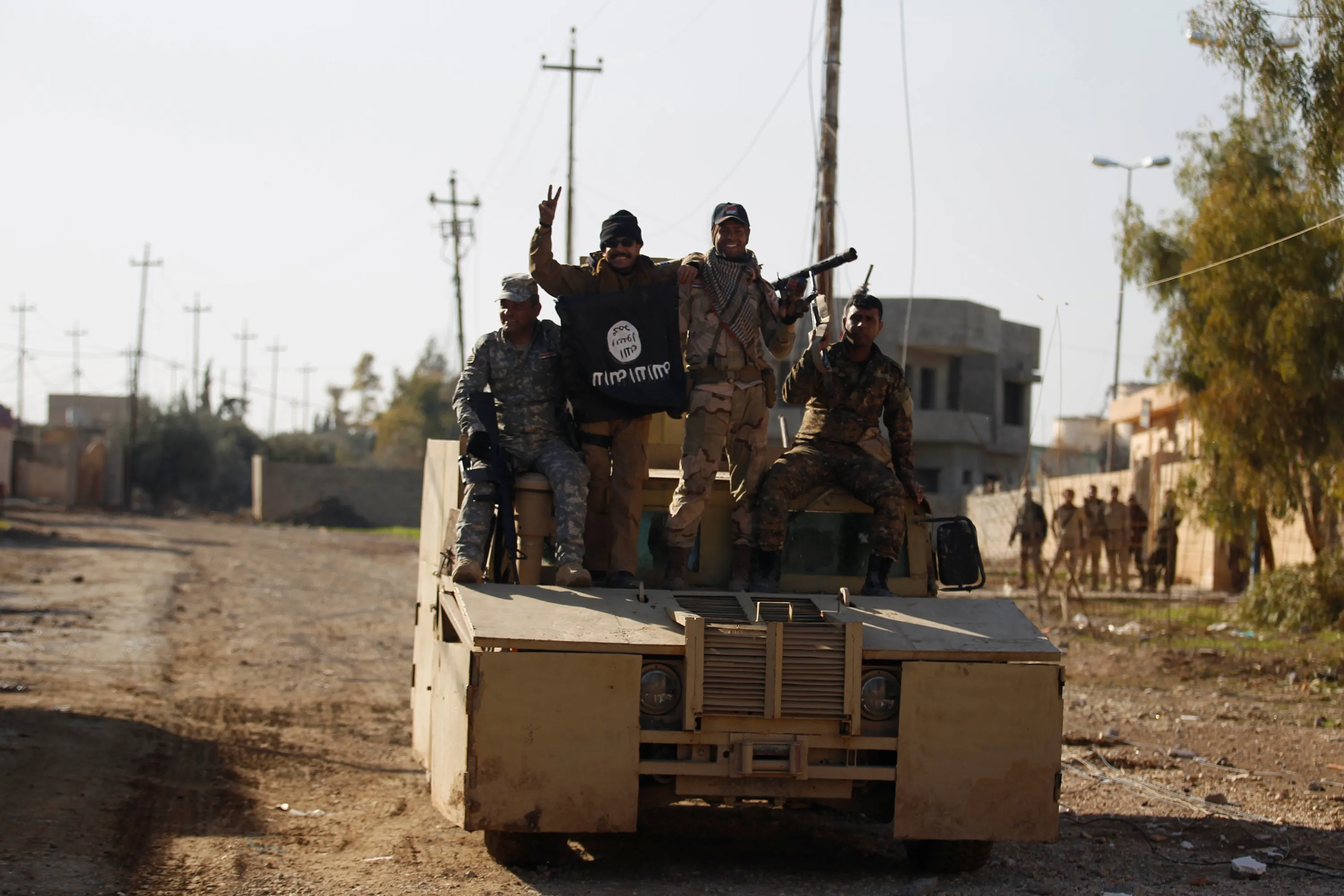 Iraqi soldiers carry an Islamic State flag which they pulled down during a battle with Islamic State, north of Mosul, Iraq, December 30, 2016. (Photo by Khalid al Mousily/Reuters)