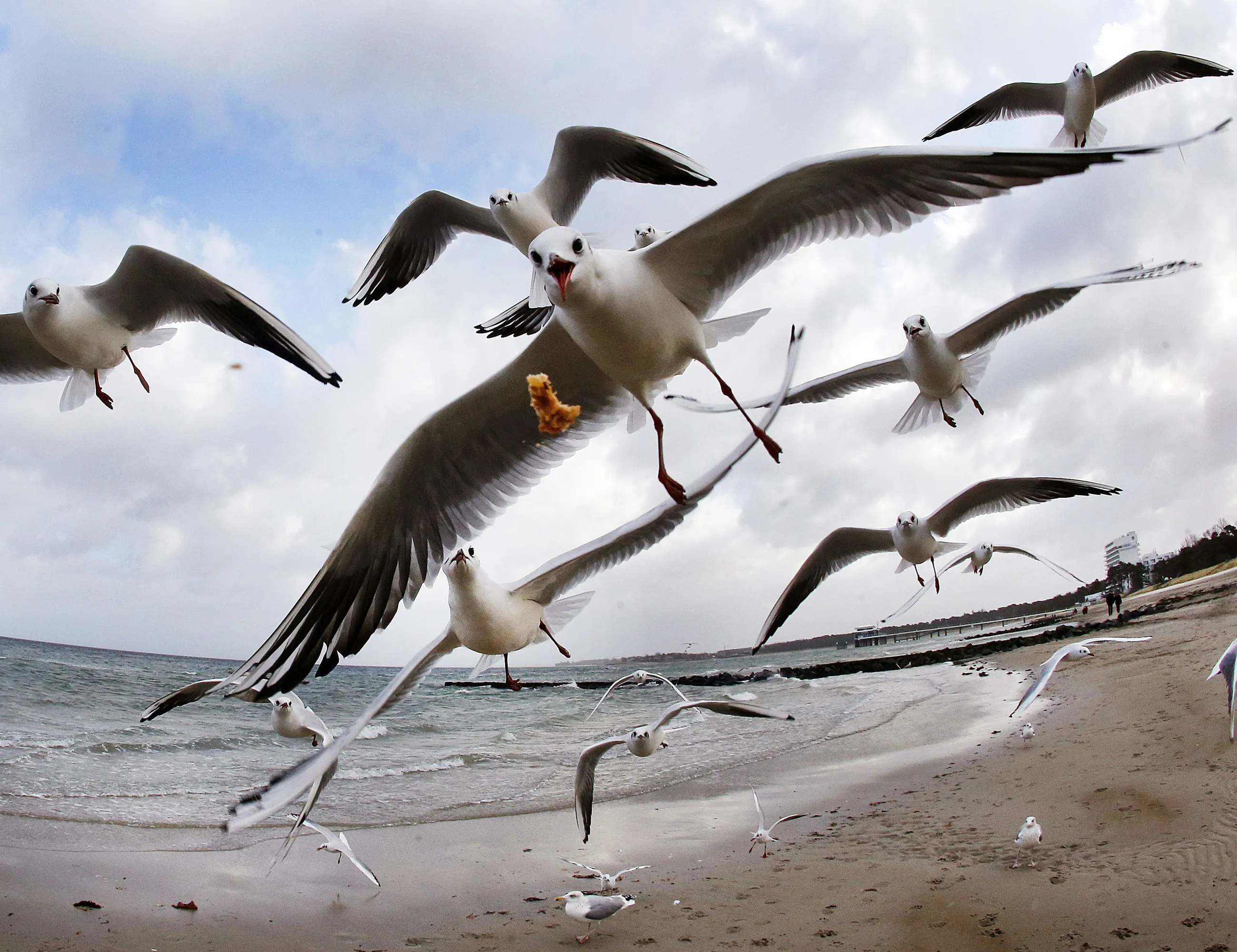 Sea gulls fly at the beach of the Baltic Sea in Timmendorfer Strand, Germany, Tuesday, December 27, 2016. (Photo by Michael Probst/AP Photo)