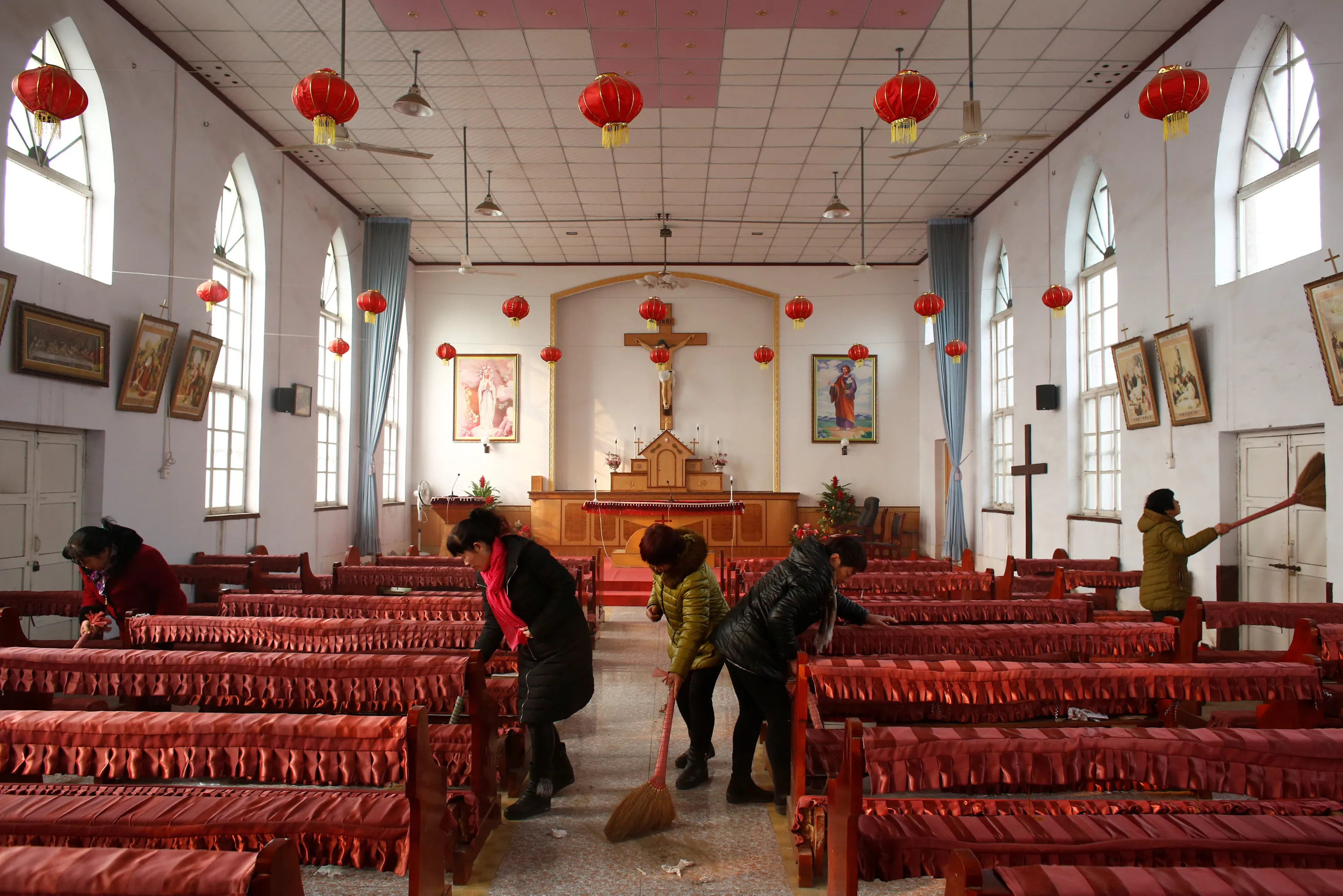 Members of the congregation clean the unofficial catholic church after Sunday service in Majhuang village, Hebei Province, China, December 11, 2016. (Photo by Thomas Peter/Reuters)