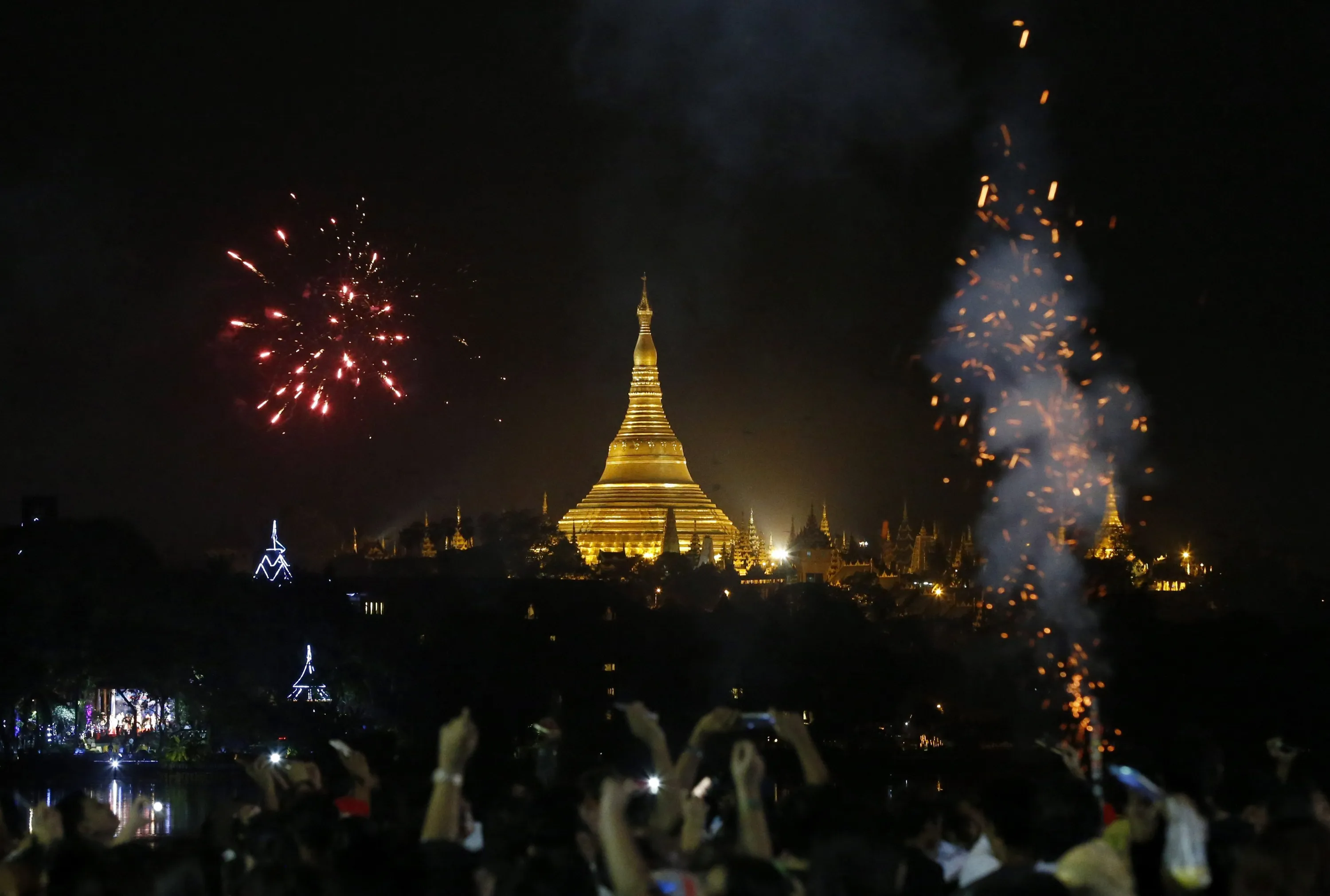 Firework illuminate the night sky over the Myanmar landmark Shwedagon pagoda during the New Year's Eve celebrations at the Kandawgyi Park in Yangon, Myanmar, 01 January 2017. (Photo by Nyein Chan Naing/EPA)