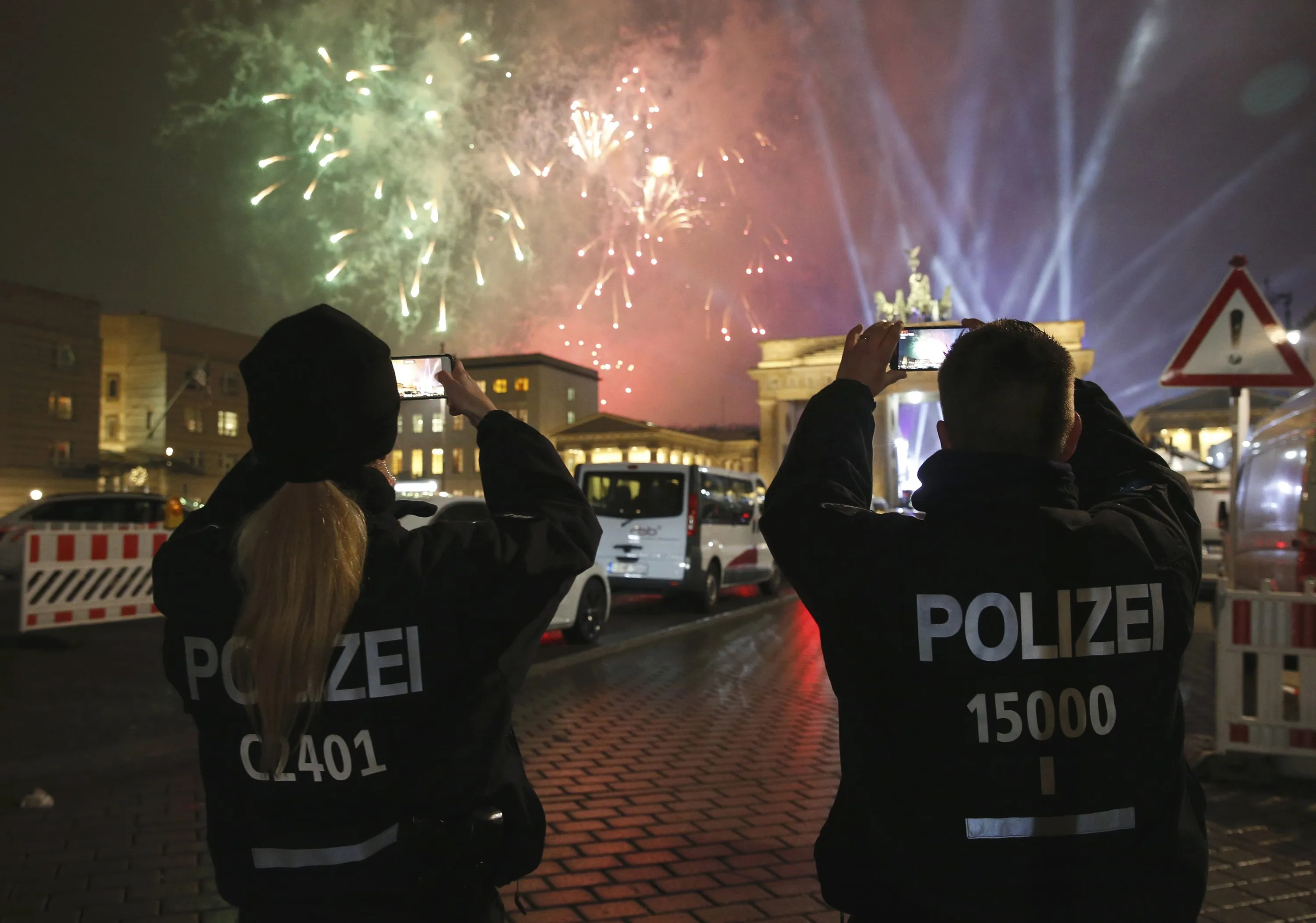 German police officers take pictures as fireworks explode next to the Quadriga sculpture atop the Brandenburg gate during New Year celebrations in Berlin, Germany, January 1, 2017. (Photo by Fabrizio Bensch/Reuters)
