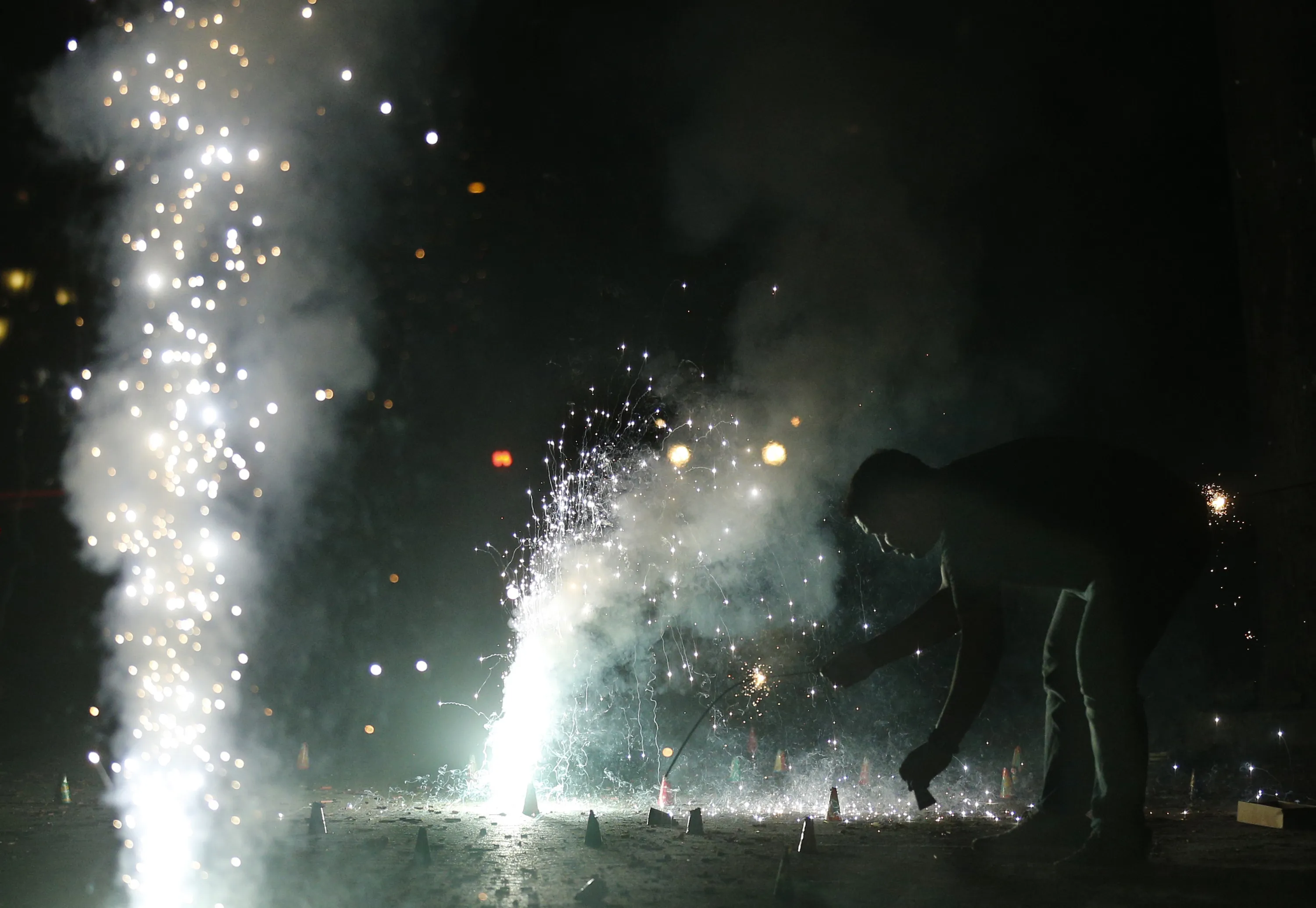 An Indian man lights firecrackers on the street during the New Year celebration in Mumbai, India, Sunday, January 1, 2017. (Photo by Rafiq Maqbool/AP Photo)