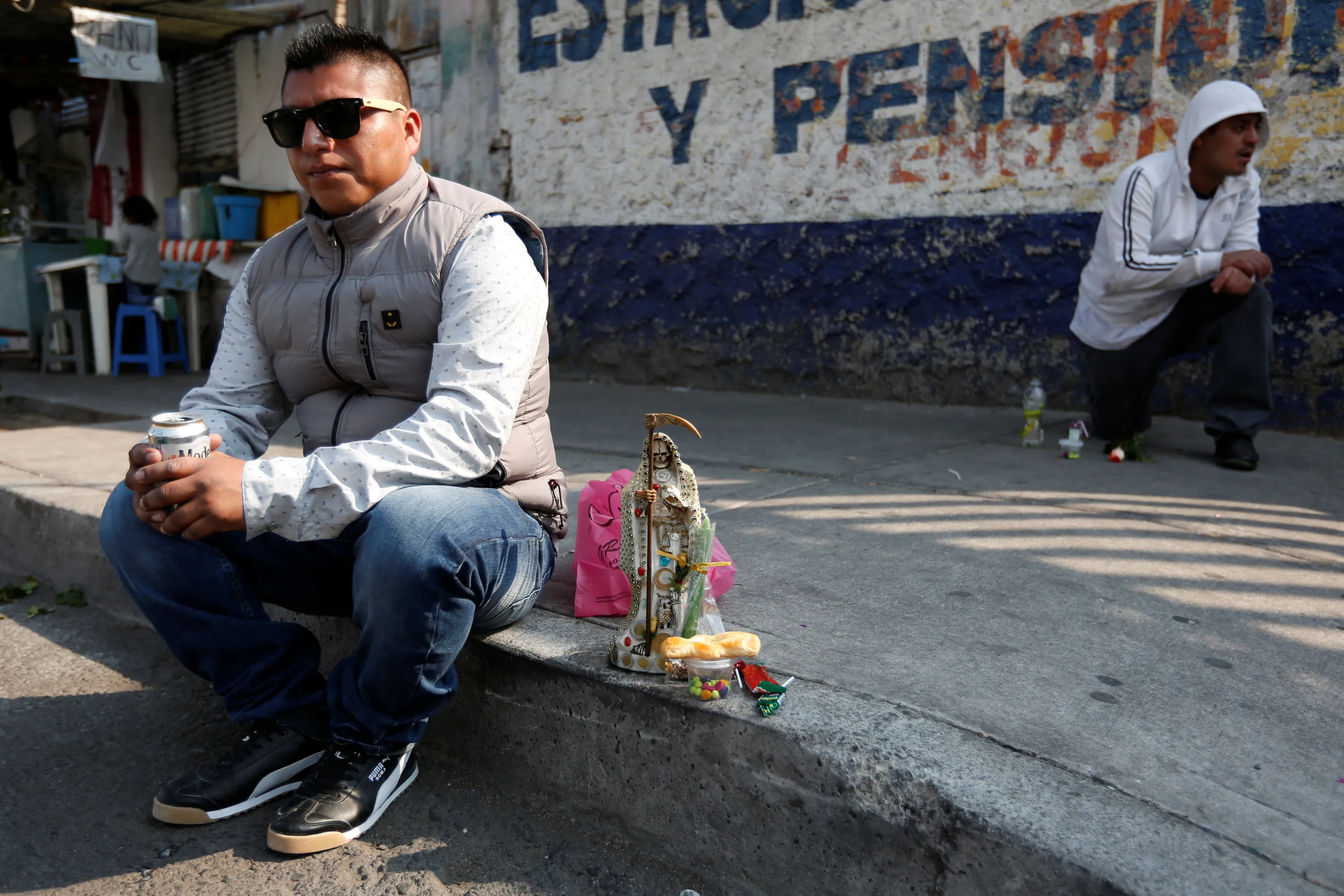 A man sits next to a figurine of Santa Muerte or The Saint of Death during the first prayer of the New Year in Mexico City, Mexico January 1, 2017. (Photo by Carlos Jasso/Reuters)