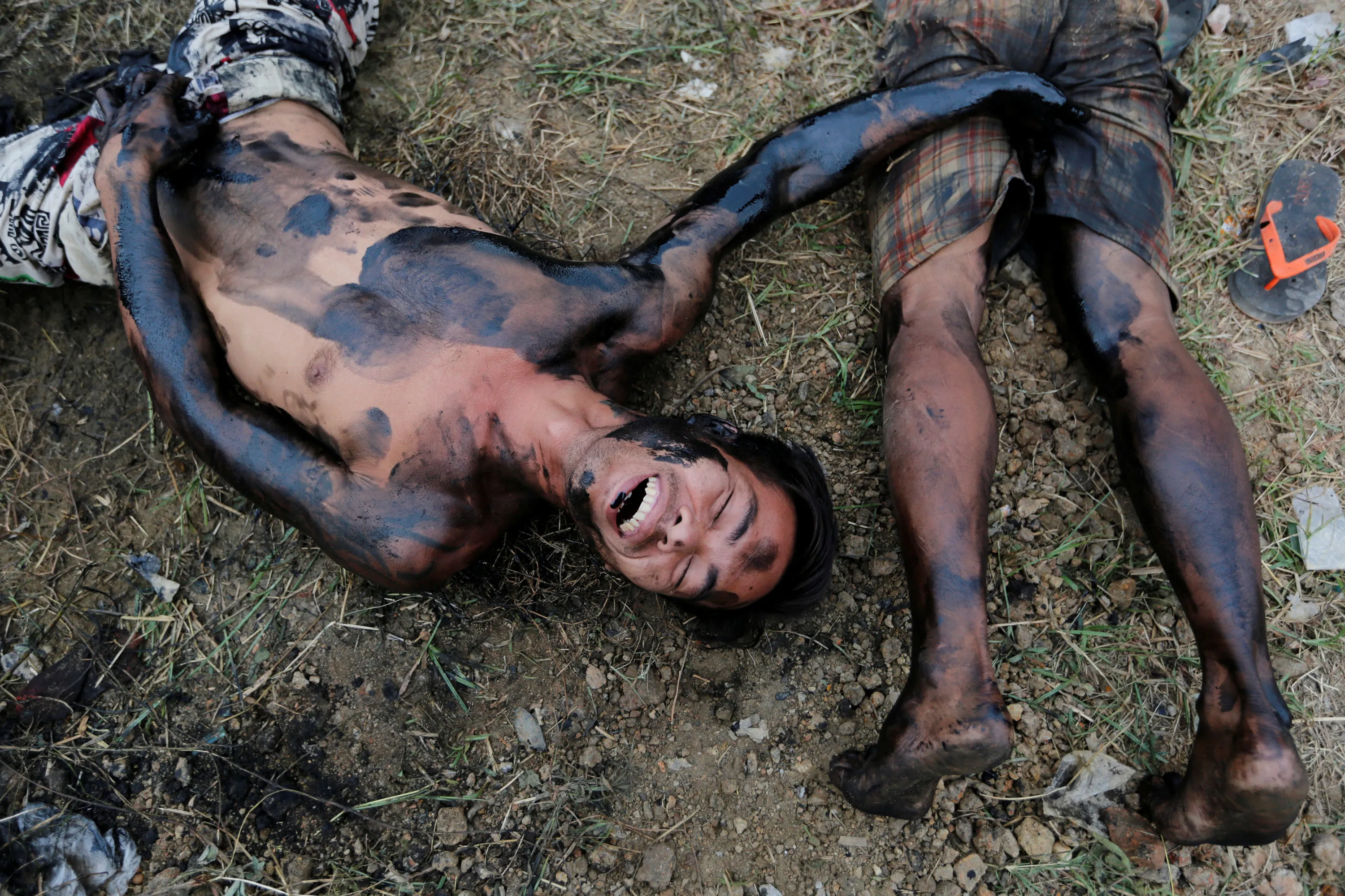 A man laughs after he fell while trying to climb an oiled bamboo pole during a festival to mark Myanmar's 69th Independence Day in Yangon, Myanmar January 4, 2017. (Photo by Soe Zeya Tun/Reuters)