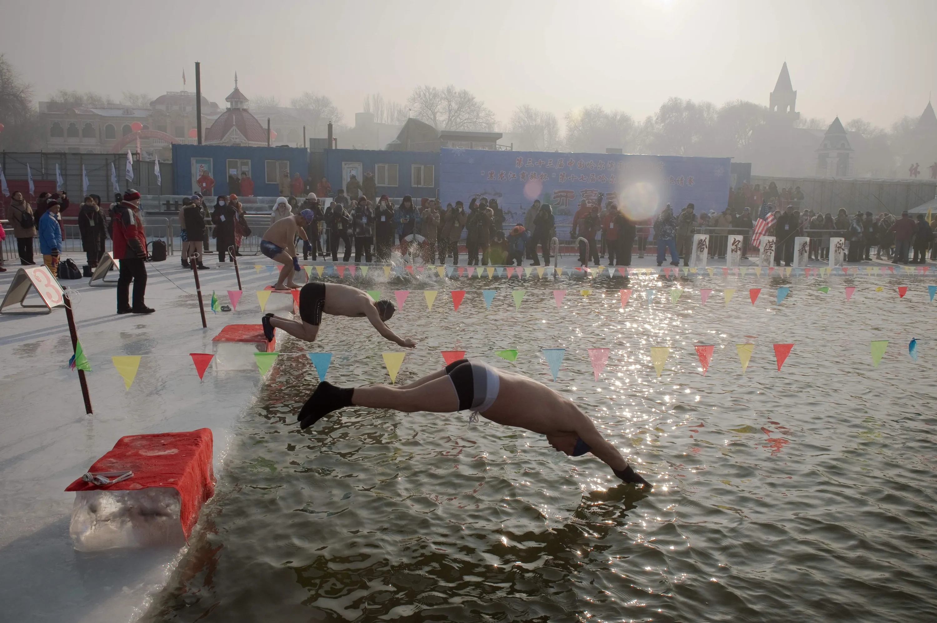 Swimmers dive into a pool cut from the frozen riverbank as part of a winter swimming competition during the 33rd Harbin Ice and Snow festival in Harbin on January 5, 2017. (Photo by Nicolas Asfouri/AFP Photo)