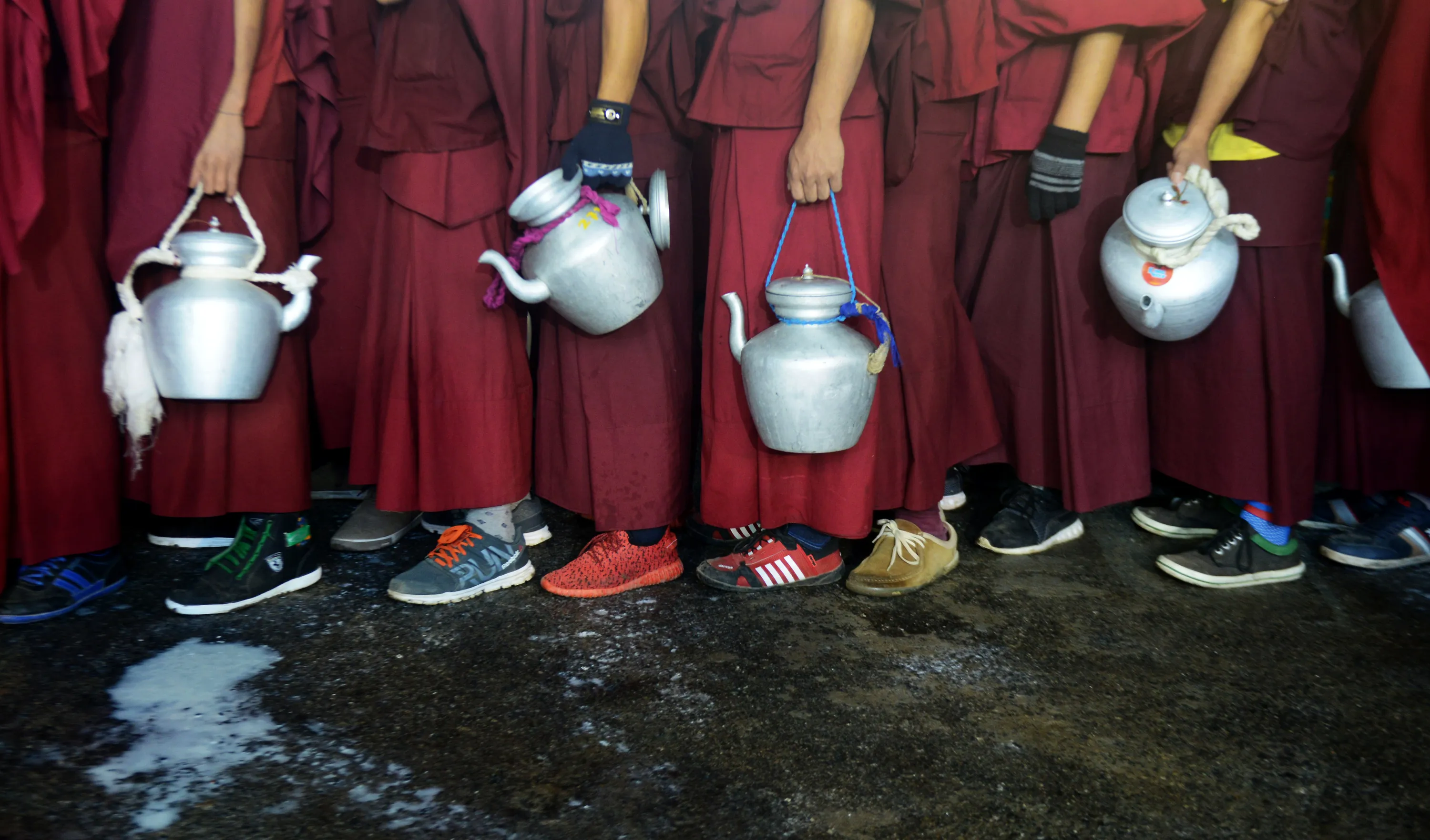 Tibetan Buddhist monks wait to collect boiling milk to distribute to devotees who are participating in a special religious prayer attended by Tibetan spiritual leader The Dalai Lama during the Kalachakra event at Bodhgaya on January 4, 2017. (Photo by Dibyangshu Sarkar/AFP Photo)