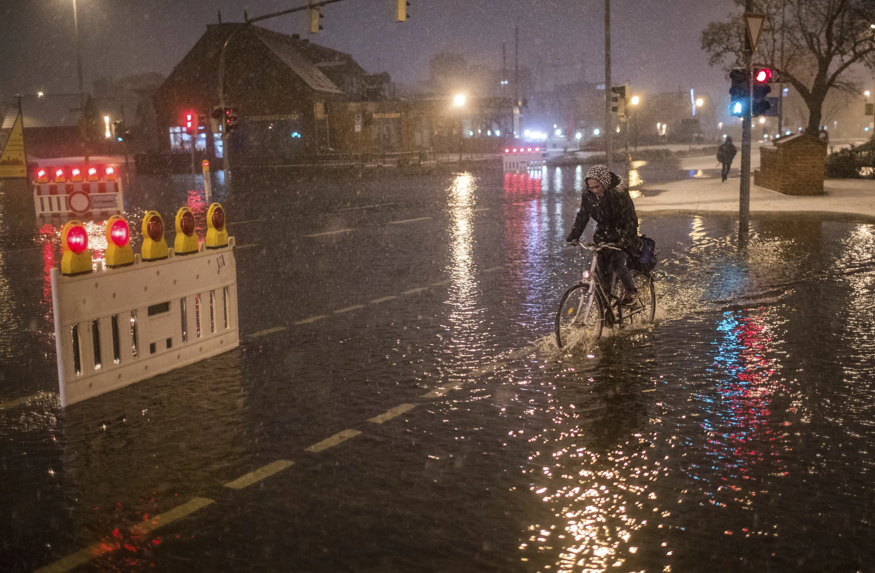 In this Thursday, January 4, 2017 photo a woman rides her bicycle through flooding in Wismar, northern Germany, after the northern German coast region was hit by high tide. (Photo by Jens Buettner/DPA via AP Photo)