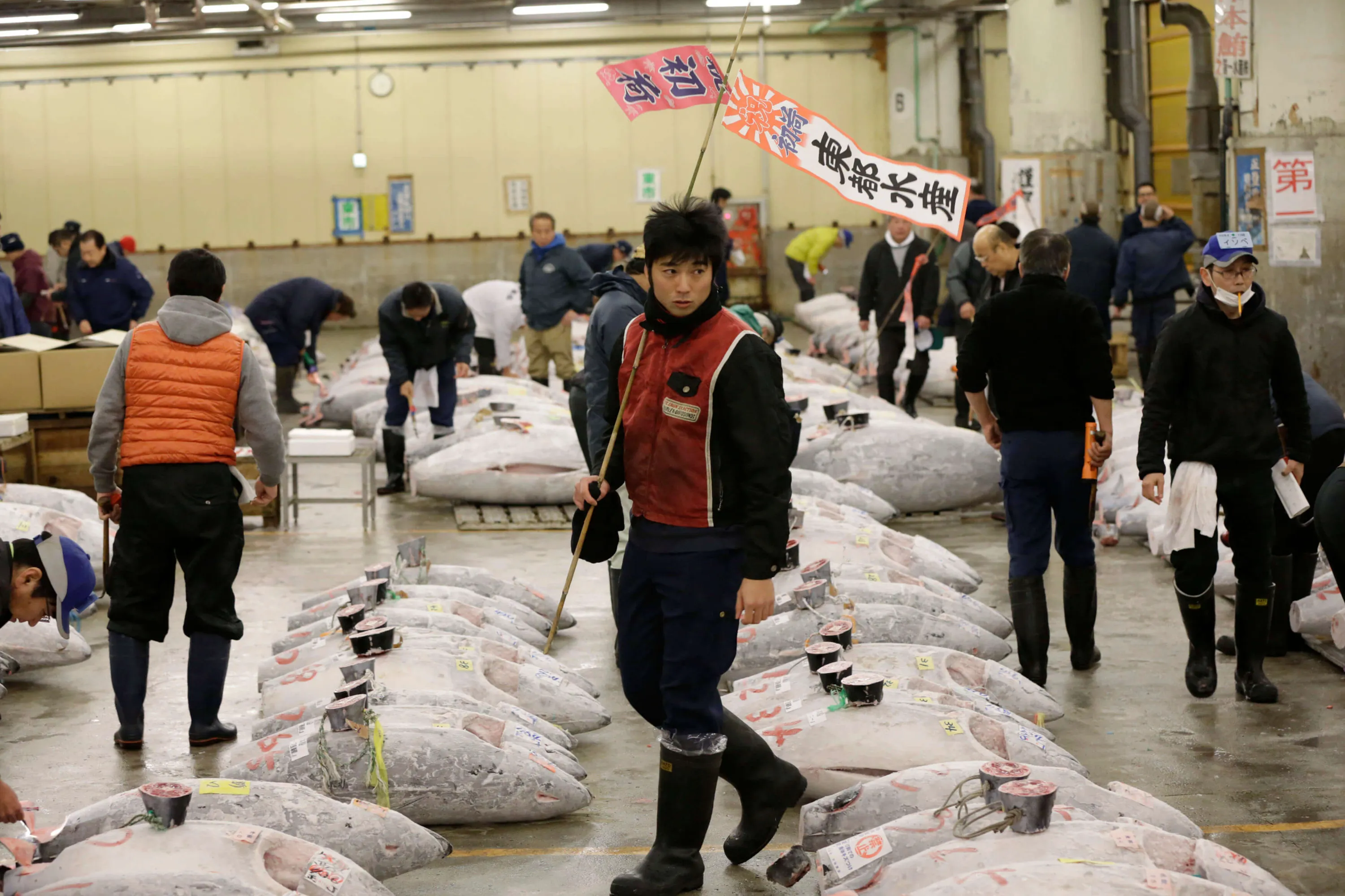 Prospective buyers inspect the quality of frozen tuna fish before the first auction of the year at Tsukiji fish market in Tokyo, early Thursday, January 5, 2017. (Photo by Eugene Hoshiko/AP Photo)