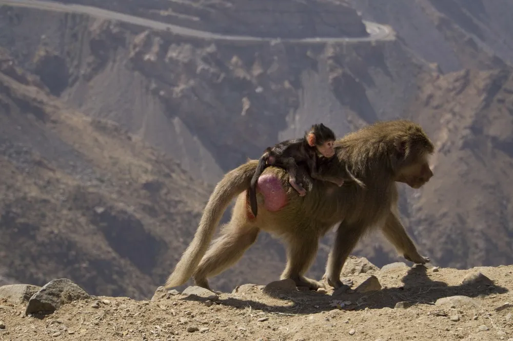 In this Friday, December 30, 2016 picture, a female desert monkey carries her baby at Al-Hada road leads to Taif city, near Muslim holy city of Mecca, Saudi Arabia. Monkeys are common on the 23 km, 14 miles, mountain road which is leads to the resort city of Taif at an elevation of 1700 meters, (5577 ft) on the slopes of Sarawat Mountains. (Photo by Amr Nabil/AP Photo)