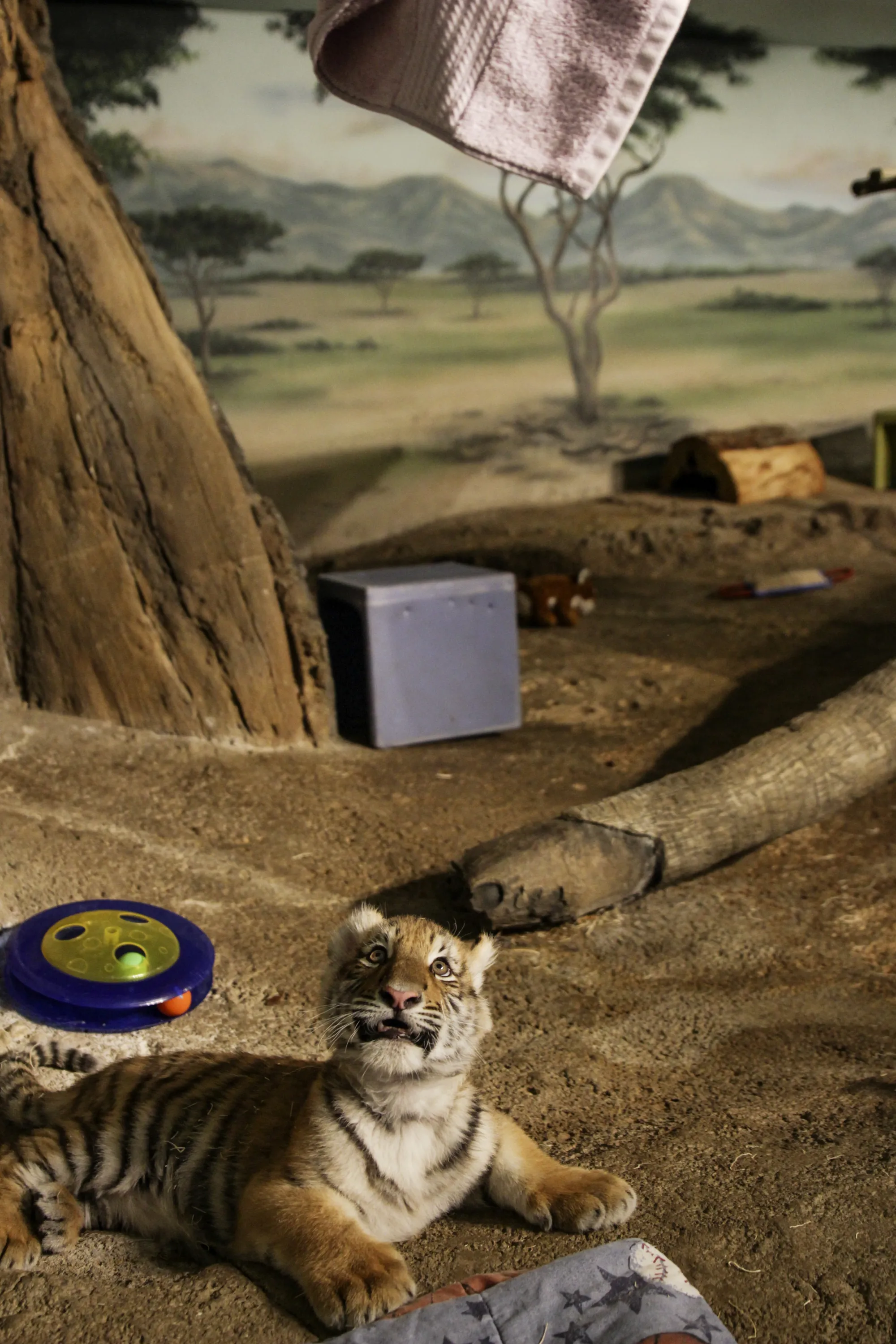 This December 12, 2016, photo, shows Kashtan, an Amur tiger cub, looking up at a towel at the Milwaukee County Zoo in Milwaukee where he is being hand-raised by staff – an unusual undertaking for a zoo. (Photo by Carrie Antlfinger/AP Photo)