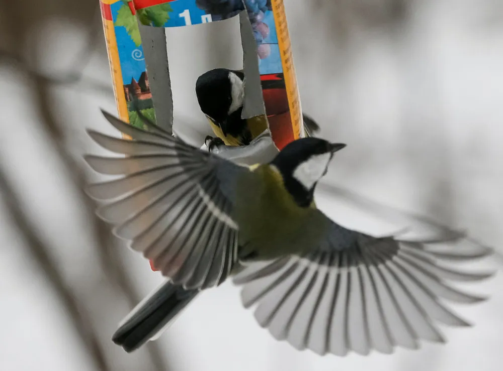 Great tit birds are seen at a feeding rack made from an empty wine carton in a park in Kiev, Ukraine, January 4, 2017. (Photo by Gleb Garanich/Reuters)