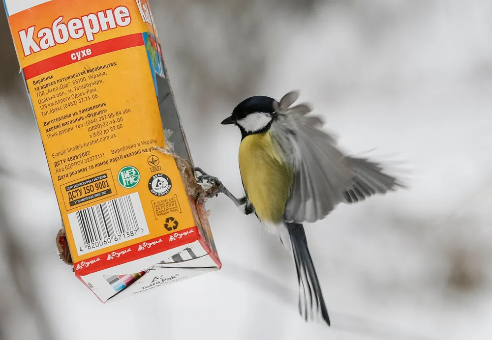 A great tit bird sits on a feeding rack made from an empty wine carton in a park in Kiev, Ukraine, January 4, 2017. (Photo by Gleb Garanich/Reuters)