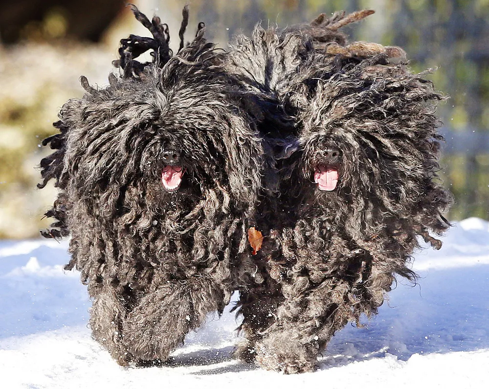 The two Pulis Quastie and Gin-Gin run in the snow in their garden in Lautertal, southern Germany, Thursday, January 5, 2017. (Photo by Michael Probst/AP Photo)