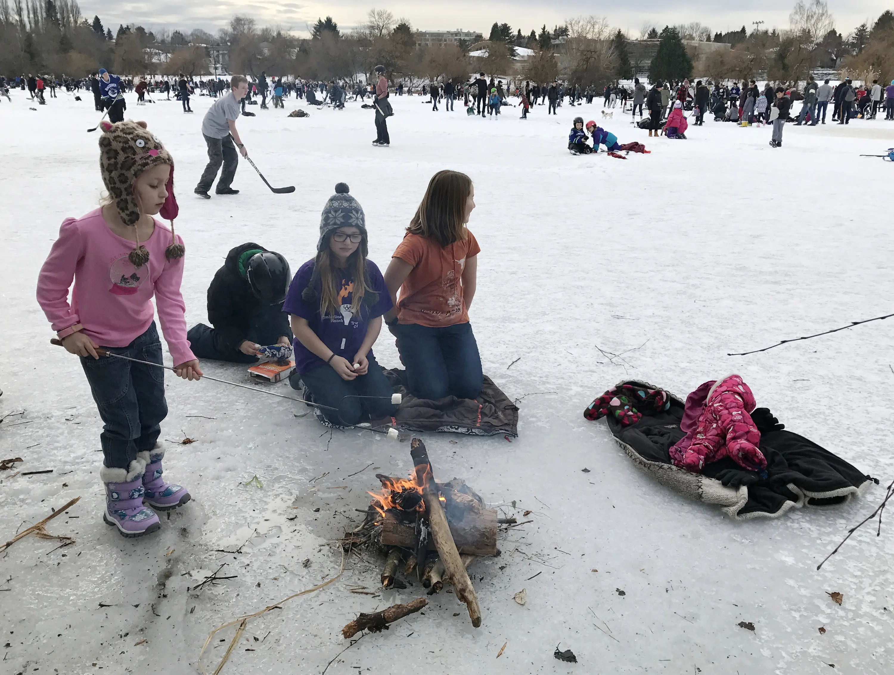 Jubilee Martens, 7, roasts marshmallows over a campfire as others skate on the frozen Trout Lake during a spell of cold weather in Vancouver, British Columbia, Canada January 7, 2017. (Photo by Chris Helgren/Reuters)