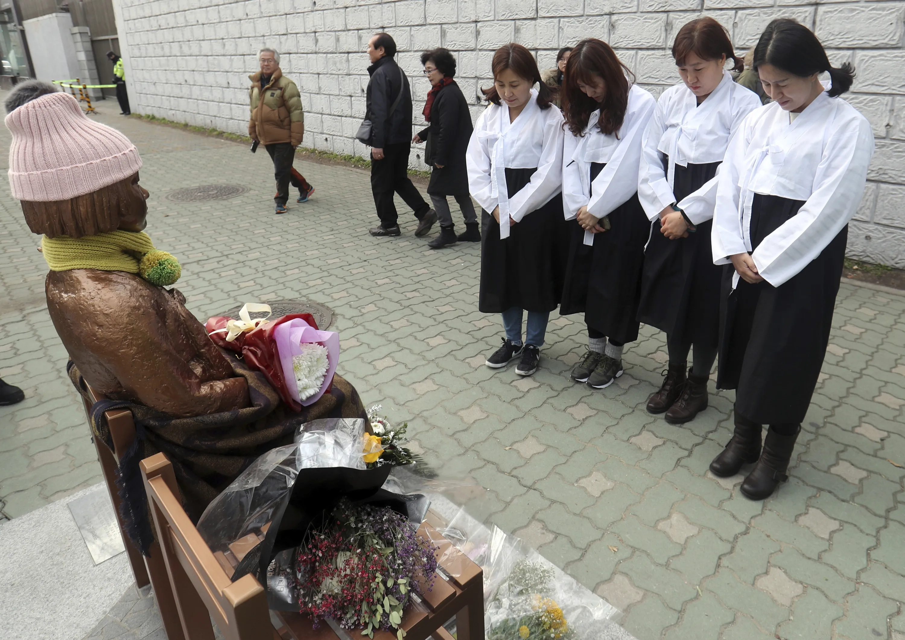 South Korean women wearing traditional dress pay theirs respects to a “comfort-woman” statue set up in front of the Japanese consulate in Busan, South Korea, Friday, January 6, 2017. Japan announced Friday that it would recall its ambassador to South Korea and suspend economic talks in response to the placing of a “comfort-woman” statue representing wartime sex slaves in front of its consulate in the Korean port city of Busan. (Photo by Kim Sun-ho/Yonhap via AP Photo)