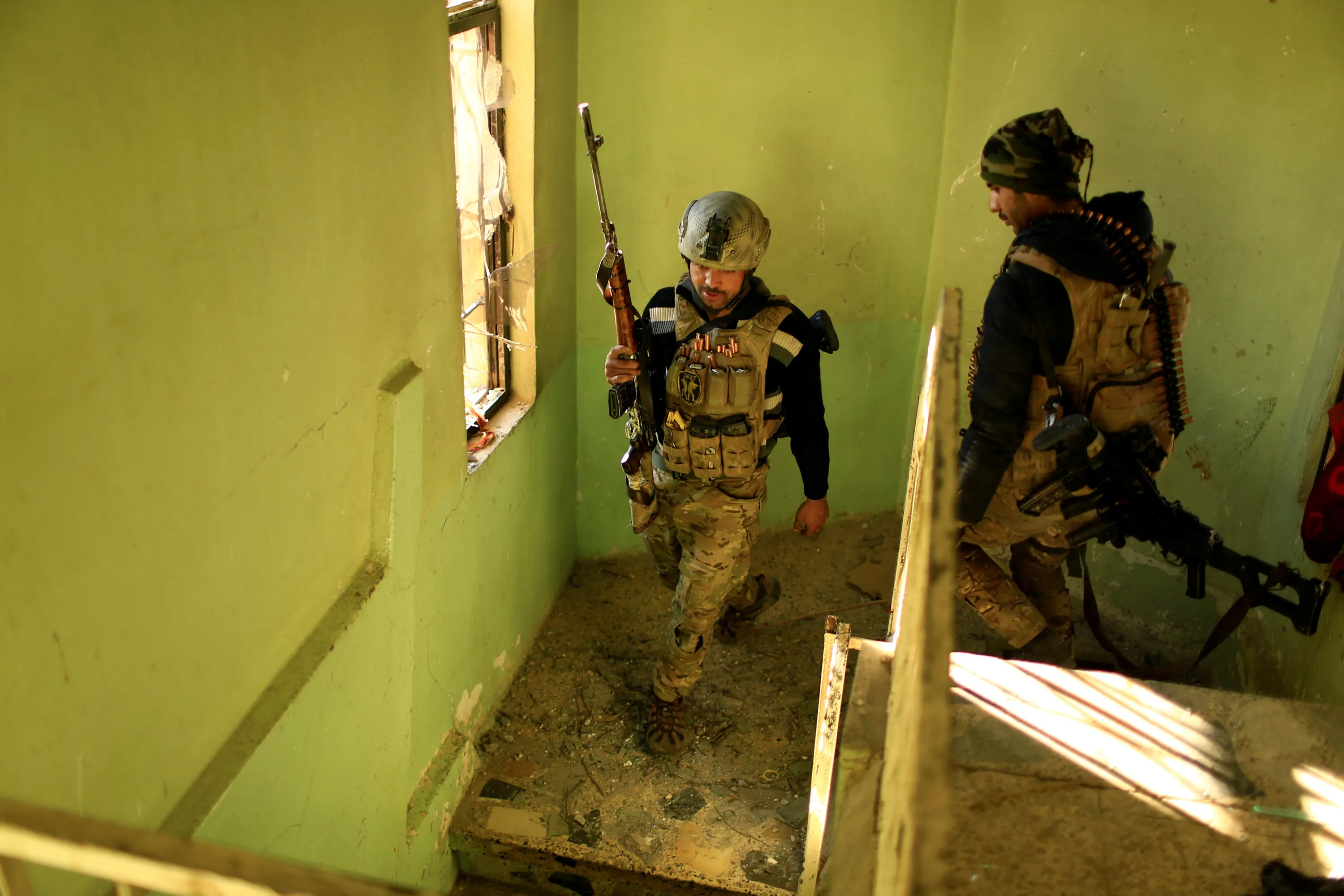Iraqi rapid response forces walk in the building during battle with Islamic State militants in the Mithaq district of eastern Mosul, Iraq, January 3, 2017. (Photo by Thaier Al-Sudani/Reuters)