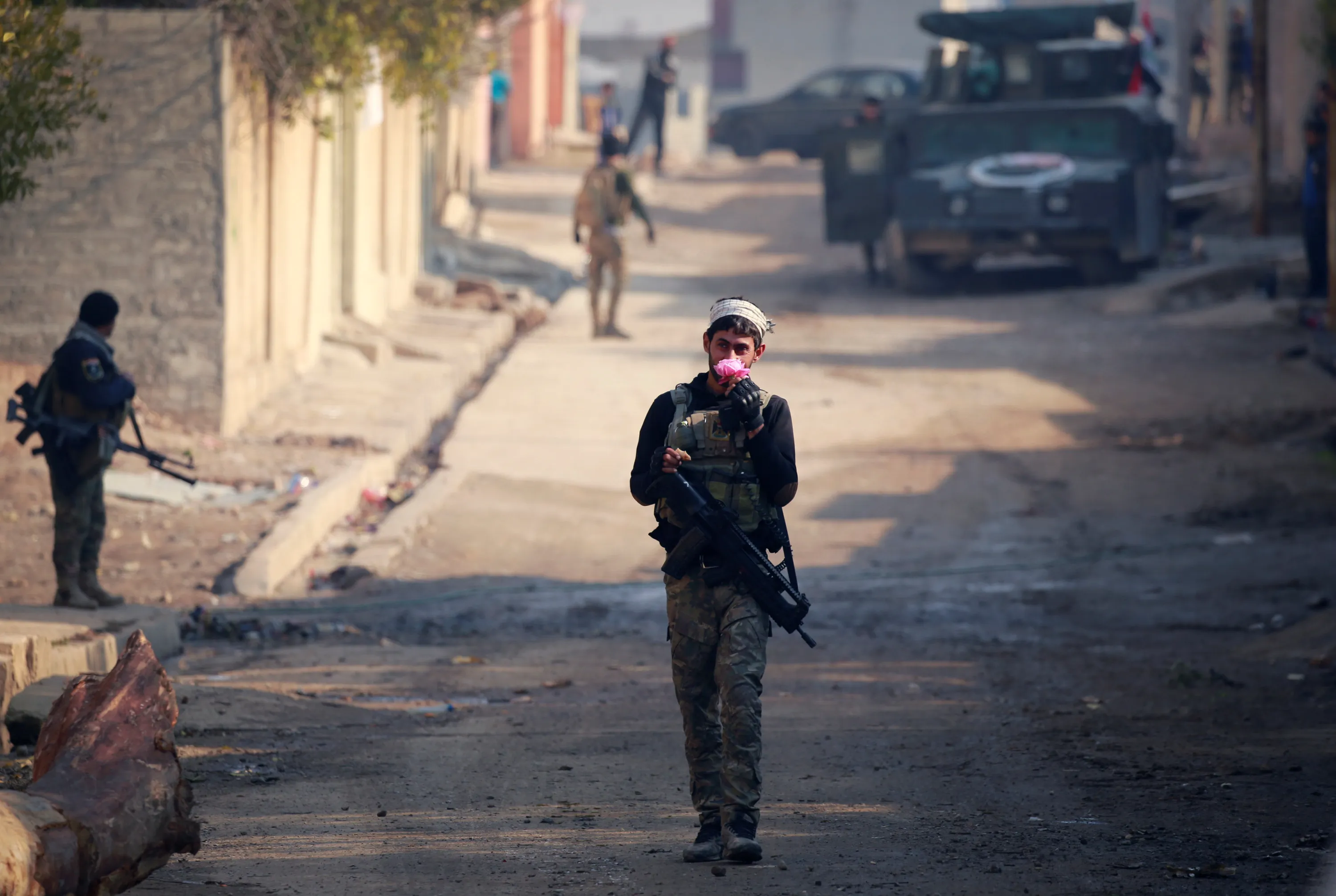 A member of Iraqi rapid response forces holds a flower during battle with Islamic State militants in the Mithaq district of eastern Mosul, Iraq, January 4, 2017. (Photo by Thaier Al-Sudani/Reuters)