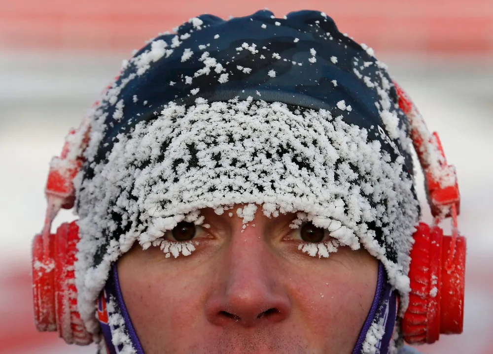 A runner with his face covered with hoarfrost competes during the traditional half Marathon amateur competition marking the Orthodox Christmas Day festivities, with the air temperature at about minus 24 degrees Celsius (minus 11.2 degrees Fahrenheit) in the Siberian city of Krasnoyarsk, Russia January 7, 2017. (Photo by Ilya Naymushin/Reuters)