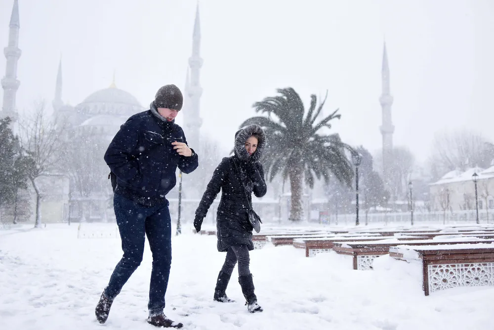 People walk in the snow, in the historic Sultanahmet district in Istanbul, Saturday, January 7, 2017. Heavy snow clogged roads, shipping traffic in Bosphorus and forced hundreds of flight cancellations in the Turkish metropolis. (Photo by Mert Akyol/Depo Photos via AP Photo)