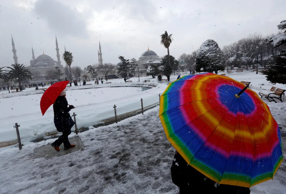 People stroll at the snow-covered Sultanahmet square in Istanbul, Turkey, January 8, 2017. (Photo by Murad Sezer/Reuters)