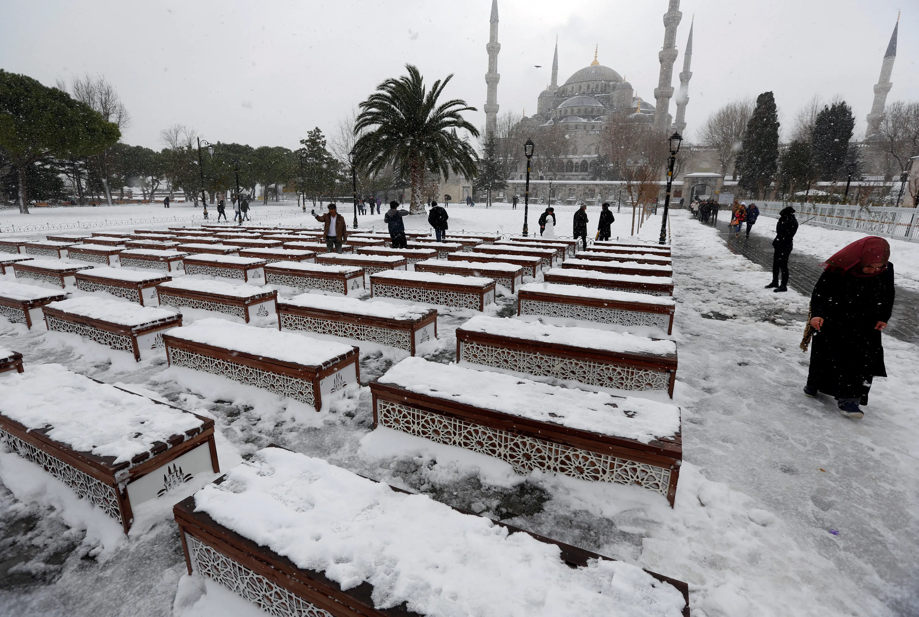 People stroll at the snow-covered Sultanahmet square in Istanbul, Turkey January 8, 2017. The Ottoman-era Sultanahmet mosque, known as the Blue mosque is seen in the background. (Photo by Murad Sezer/Reuters)