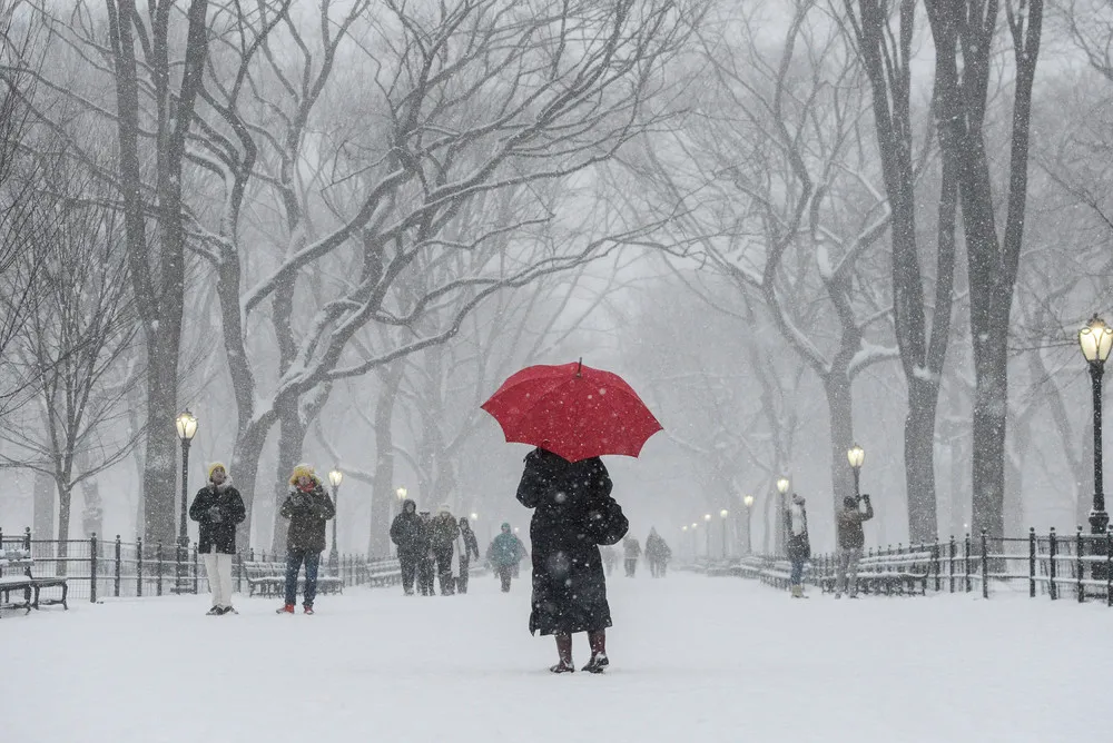 A woman walks through Central Park with a red umbrella during a snow storm in New York City, U.S. January 7, 2017. (Photo by Stephanie Keith/Reuters)