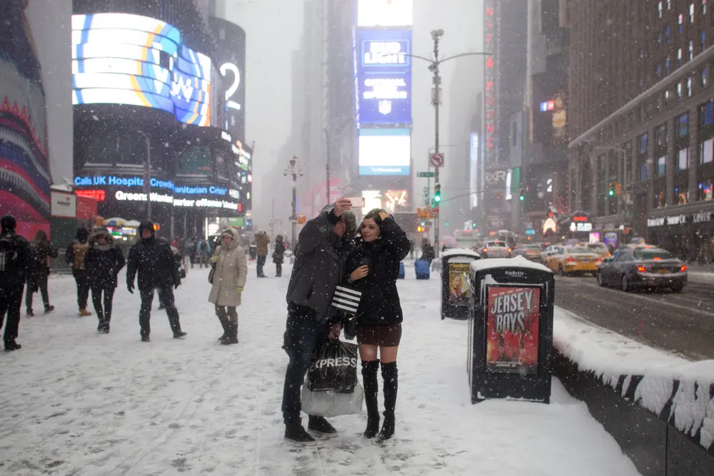 People take a selfie in Times Square on a snowy day in New York City, U.S., January 7, 2017. (Photo by Alex Wroblewski/Reuters)