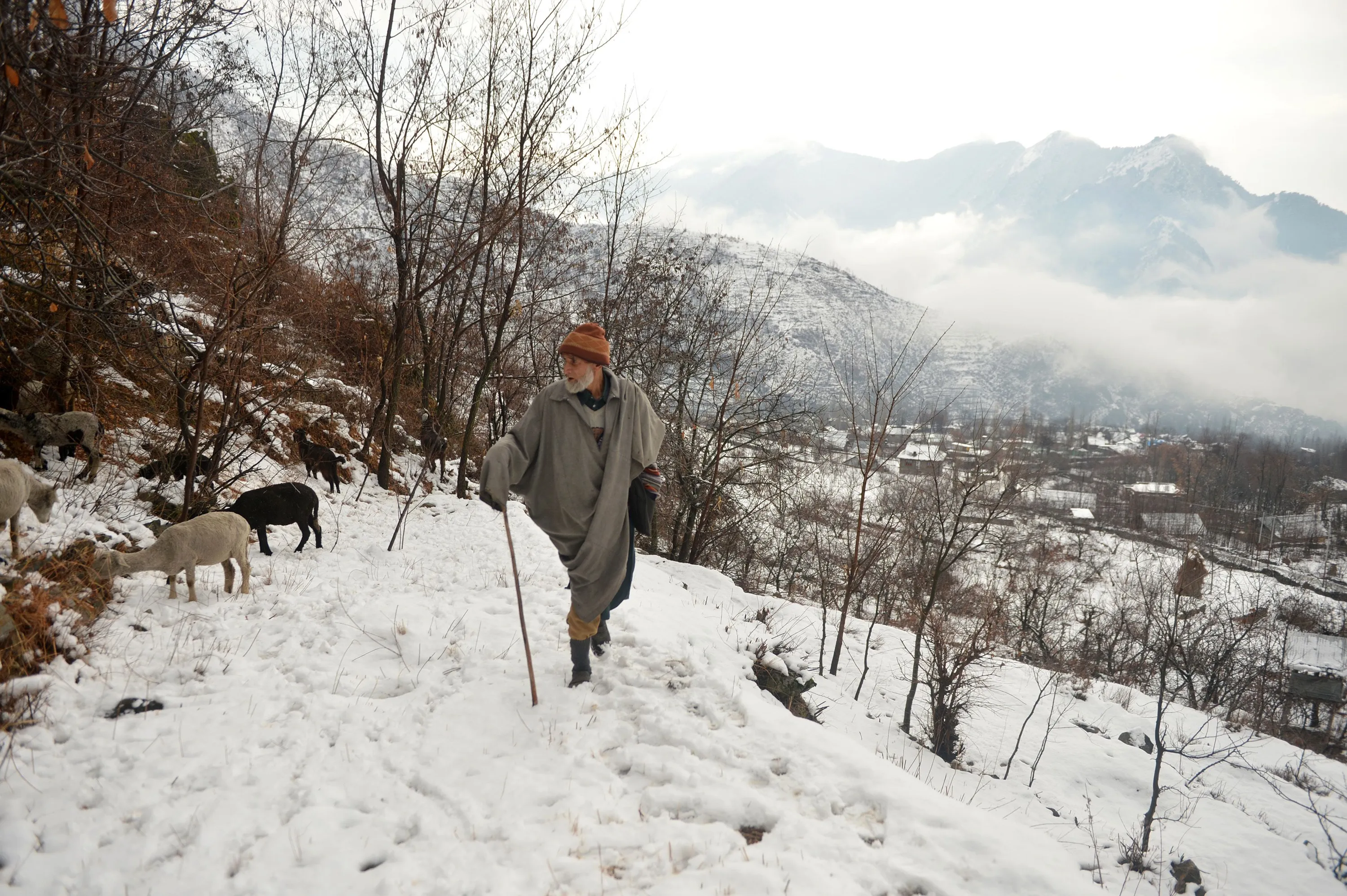A shepherd tends to his flock after a snowfall on the outskirts of Srinagar on January 5, 2017. The sub-zero temperatures has frozen many water bodies in Kashmir and even drinking water taps have frozen at some places. (Photo by Tauseef Mustafa/AFP Photo)