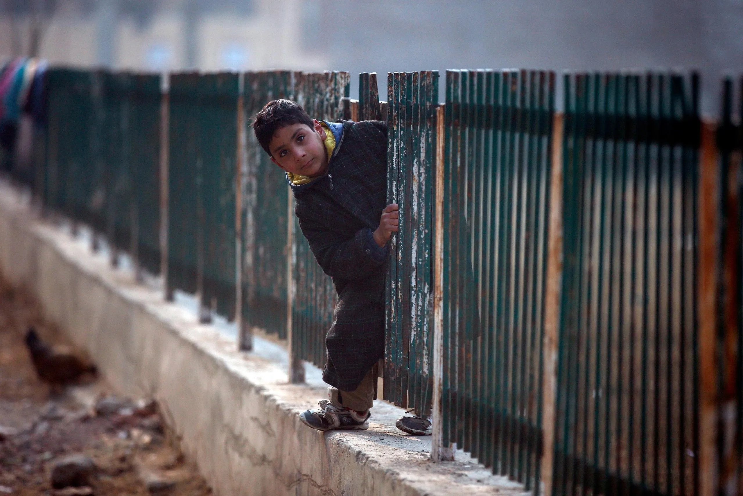 A boy looks on as he passes through an opening in a fence, laid on the boundary of a playground in a neighbourhood in Srinagar December 28, 2016. (Photo by Danish Ismail/Reuters)